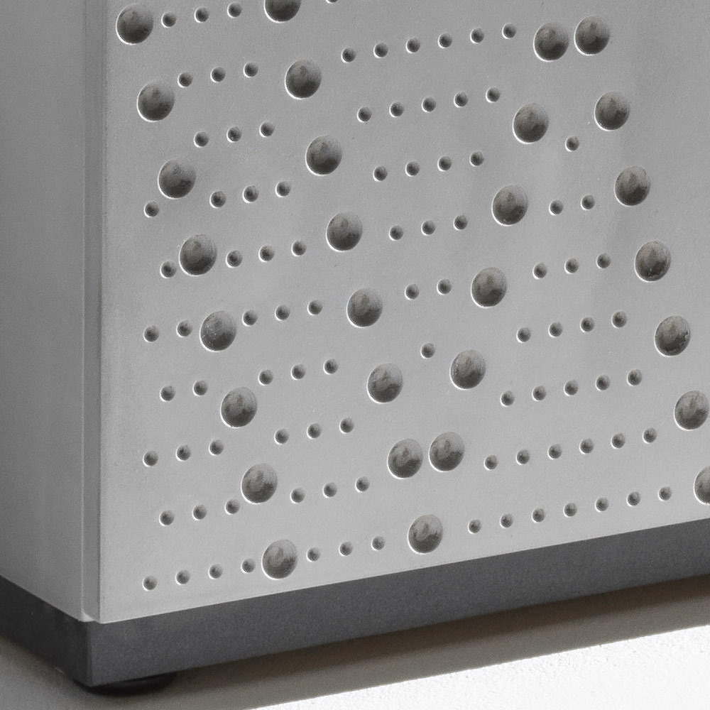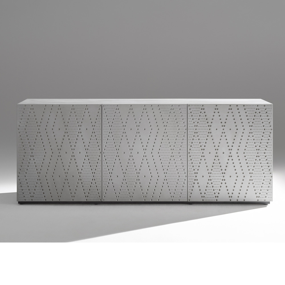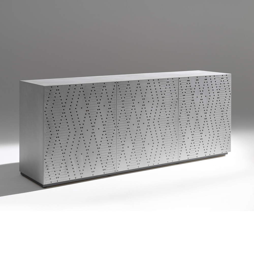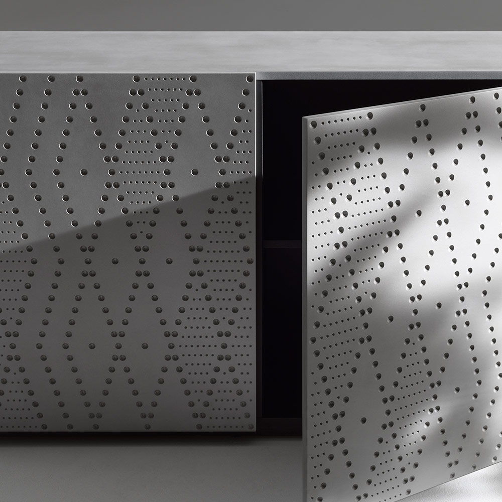 Credenza dal carattere materico e contemporaneo, definita da un raffinato decoro puntinato effetto alluminio fonderia che riveste le ante e crea un sofisticato gioco di luce e profondità. Un arredo scenografico pensato per ambienti moderni, eleganti e ricercati.