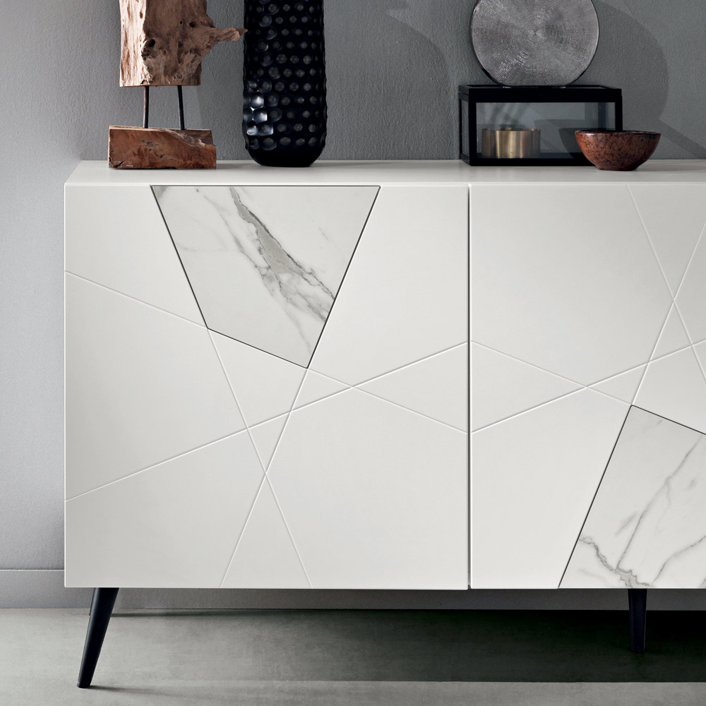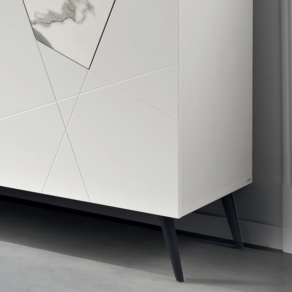 La struttura è realizzata con scocca in nobilitato e ante in MDF pantografato, caratterizzate da incisioni decorative che si incontrano in un elegante disegno geometrico. Gli inserti in vetro effetto marmo arricchiscono la superficie, creando un sofisticato gioco grafico e materico.