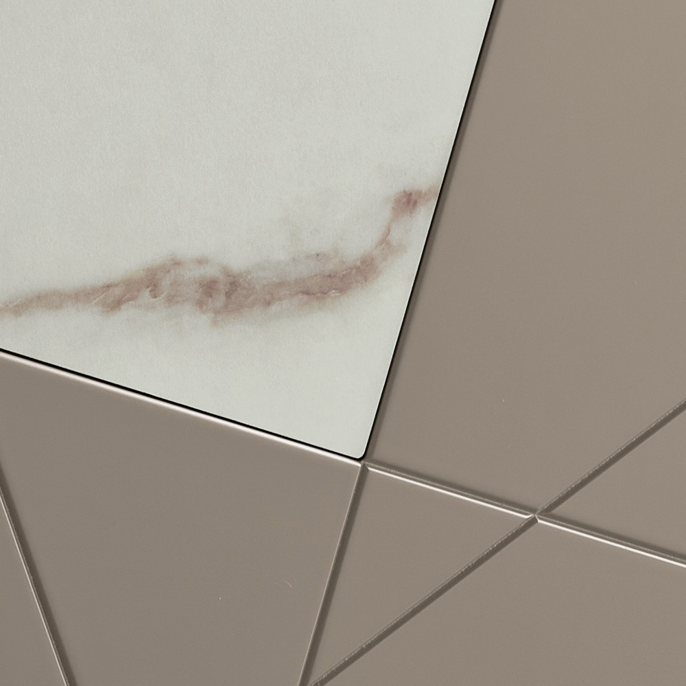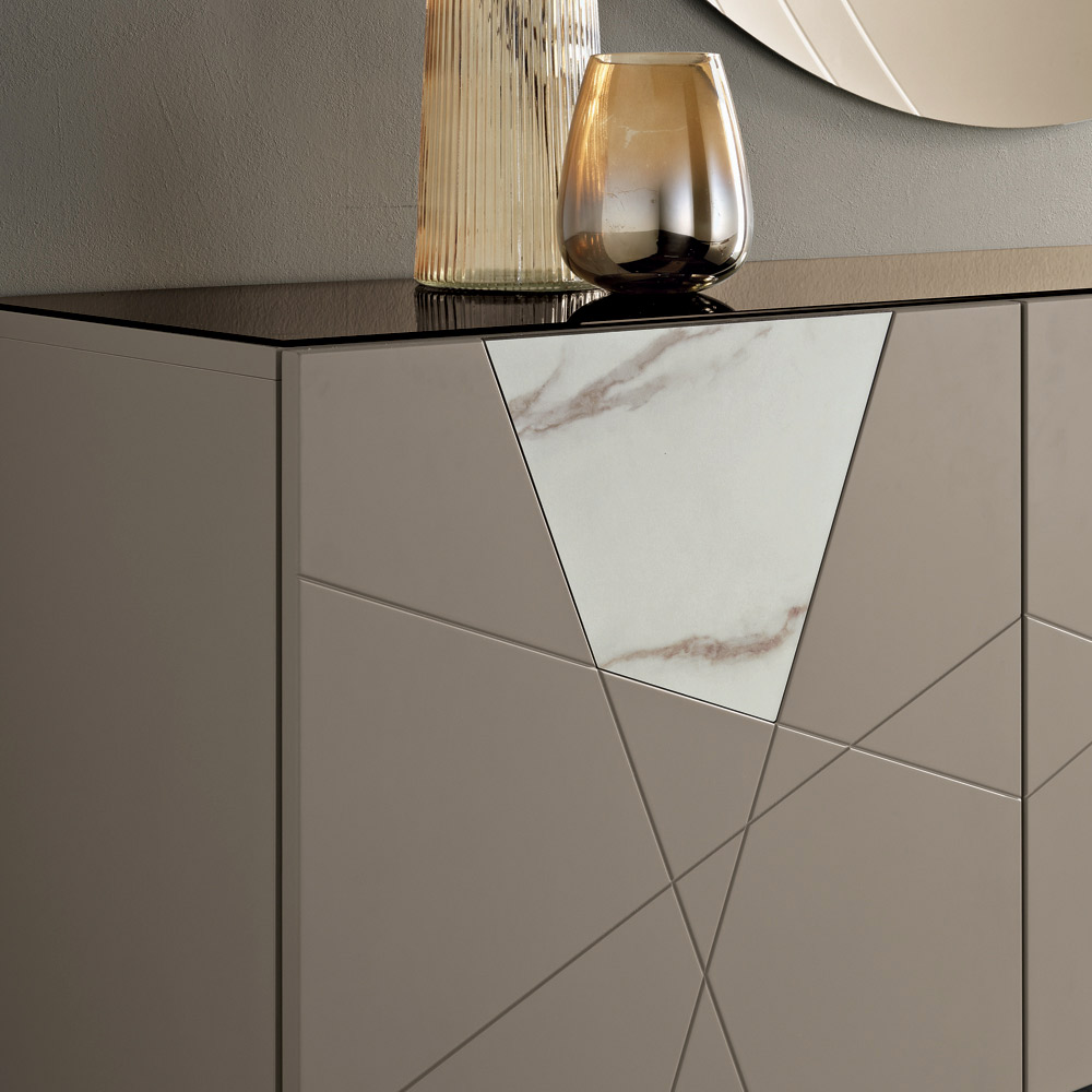 La struttura è realizzata con scocca in nobilitato, piano in vetro specchiato e ante in MDF pantografato, caratterizzate da incisioni decorative che si incontrano in un elegante disegno geometrico. Gli inserti in vetro effetto marmo arricchiscono la superficie, creando un sofisticato gioco grafico e materico.