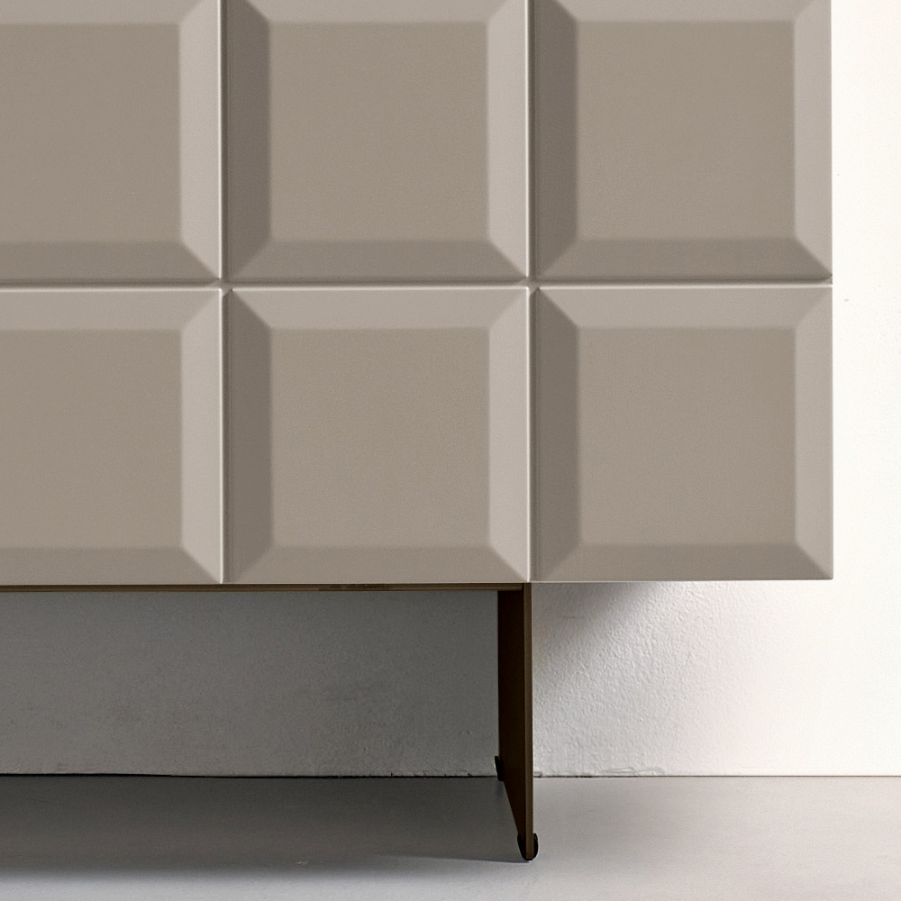 Le ante in MDF rivestito in PVC laccato sono caratterizzate da una griglia geometrica a rilievo che ricorda una raffinata composizione modulare, creando un elegante gioco di luci e ombre e donando profondità alla superficie.