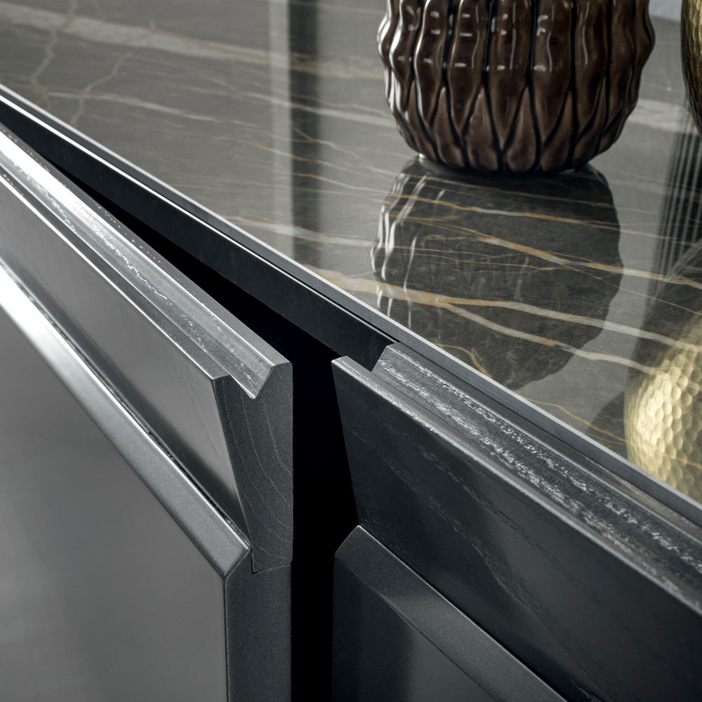 Il design così ottenuto dalla combinazione di più elementi e materiali, delinea una forma esclusiva dell’anta che gioca con le inclinazioni creando piacevoli