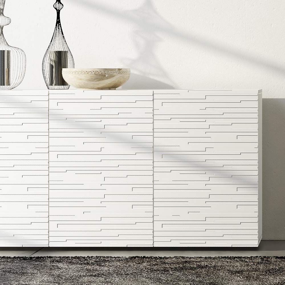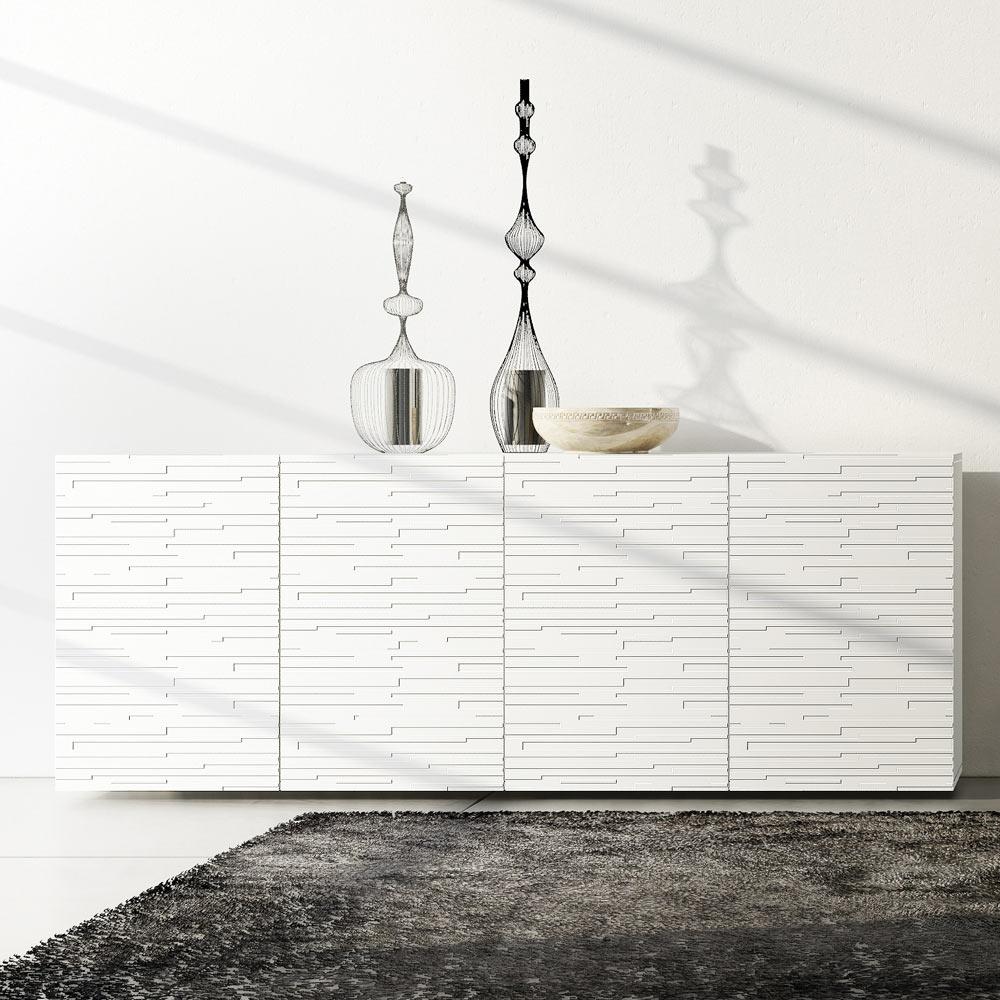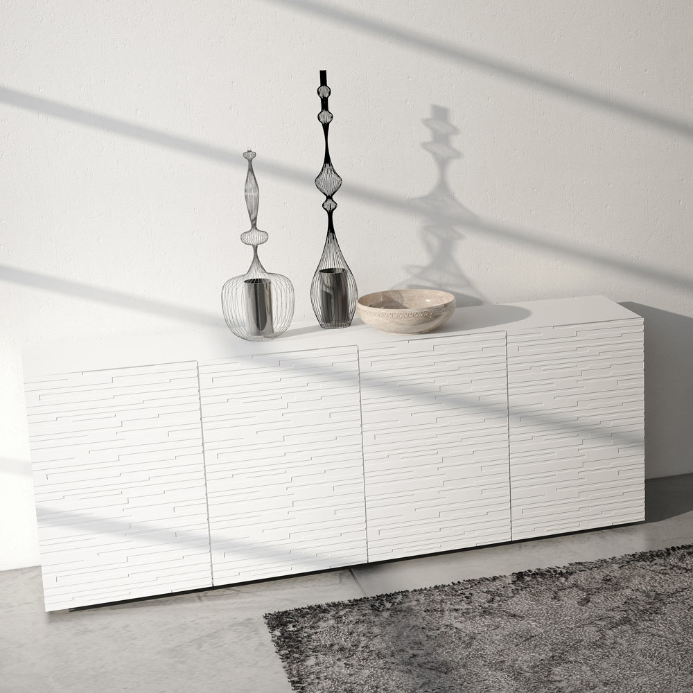 Madia da soggiorno con struttura in MDF laccato opaco e con sistema di apertura a 4 ante battenti laccate opaco bianco con decoro in bassorilievo. Questo prodotto è all'insegna della funzionalità e del design grazie alle sue finiture eleganti e raffinate e ai vari materiali usati per la realizzazione che offrono grande qualità e resistenza nel tempo donando al prodotto quel tocco unico e indimenticabile.