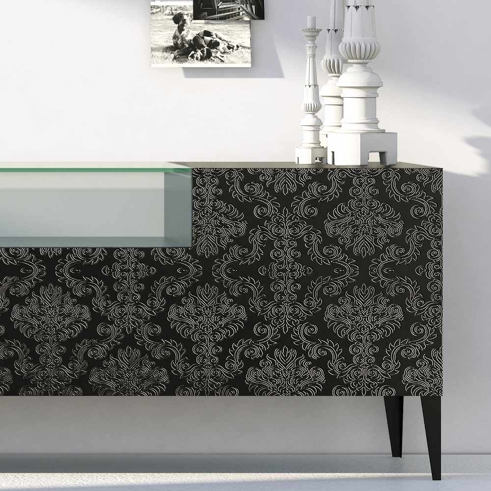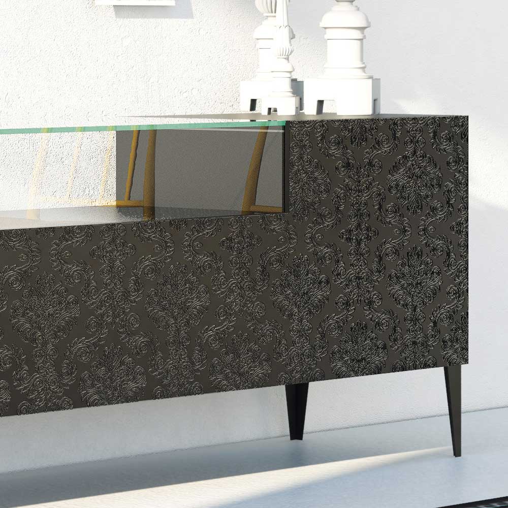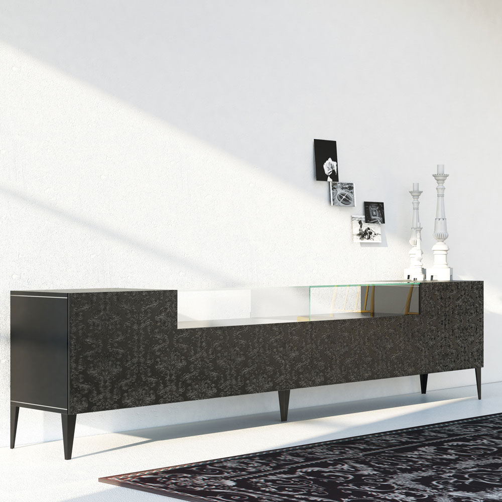 Madia da soggiorno con struttura in MDF laccato opaco e composta da 2 ante a ribalta sagomate laccate opaco nero. É compresa la teca in vetro temperato e i piedi in metallo verniciato nero. Questo prodotto è all'insegna della funzionalità e del design grazie alle sue finiture eleganti e raffinate e dal decoro in bassorilievo unico nel suo genere. I vari materiali usati per la realizzazione offrono grande qualità e resistenza nel tempo donando al prodotto quel tocco unico e indimenticabile.