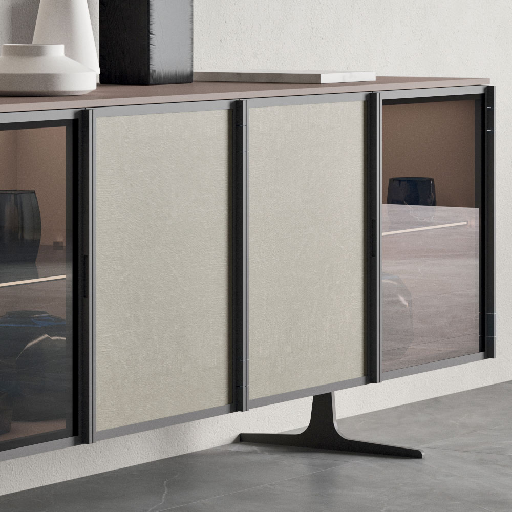 Mobile credenza a 4 ante per soggiorno in legno ecologico e vetro bronzato, made in Italy.