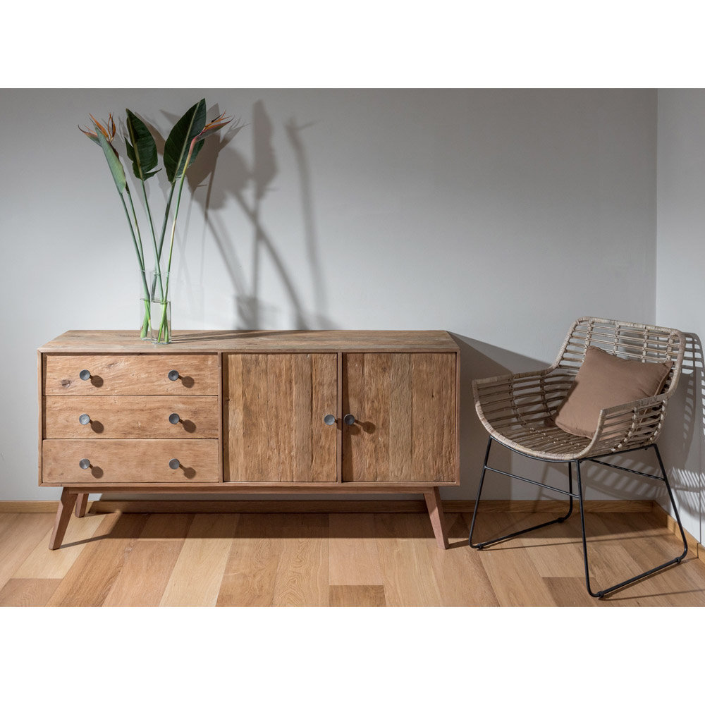 Madia da interno realizzata in legno riciclato finitura vintage natural con 2 ante e 3 cassettoni.