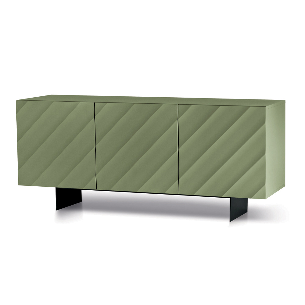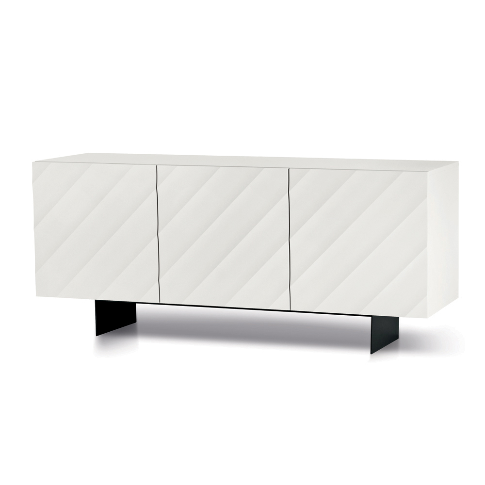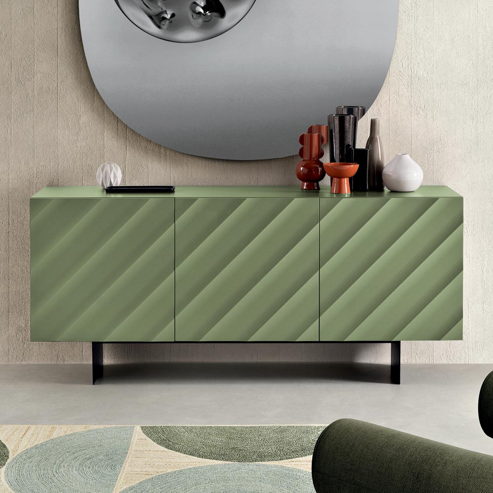 Le ante in MDF rivestito in PVC laccato sono caratterizzate da un disegno geometrico a fasce diagonali in rilievo, che crea una texture dinamica e materica. Questo motivo genera un elegante gioco di luci e ombre che varia in base all’illuminazione, donando profondità e movimento alla superficie.