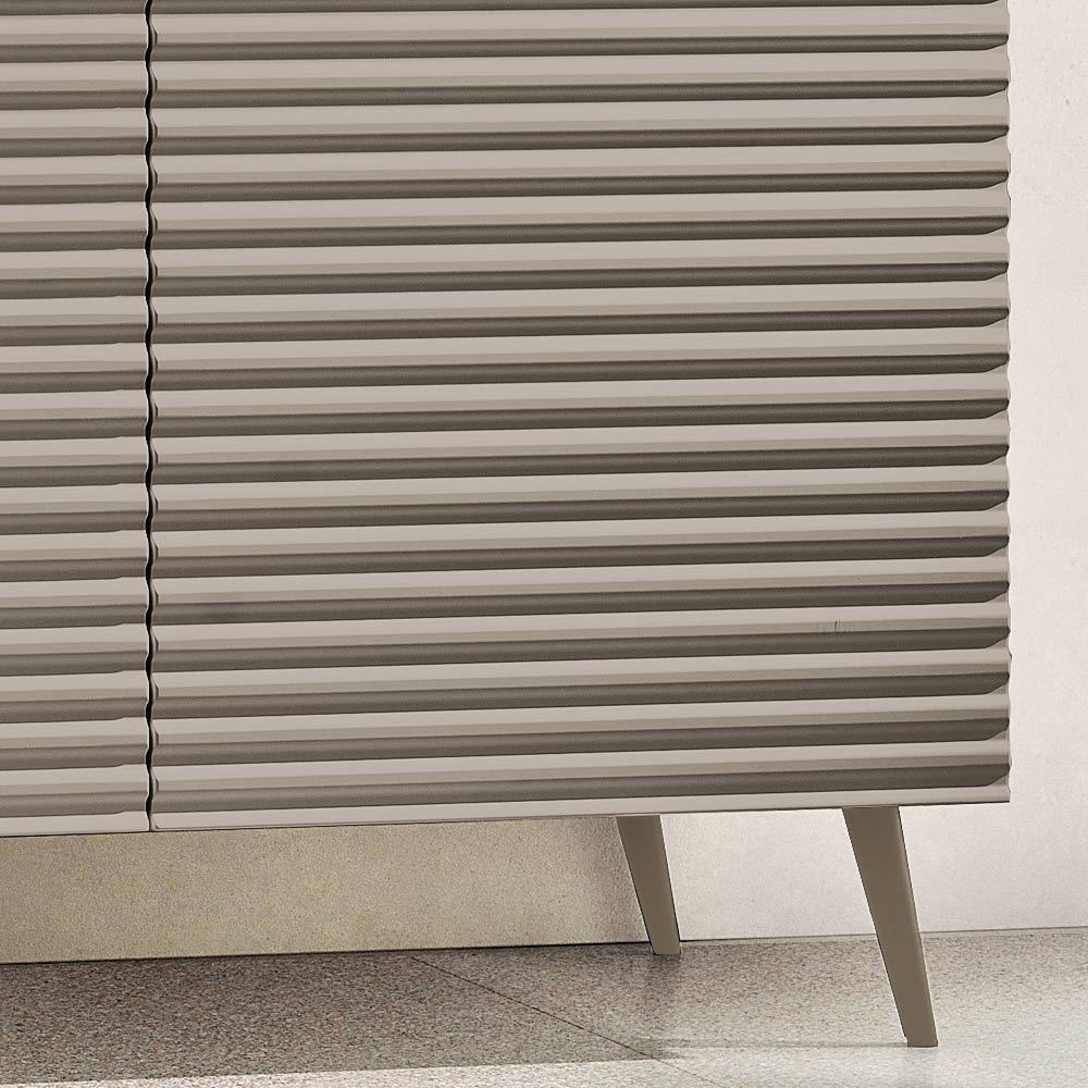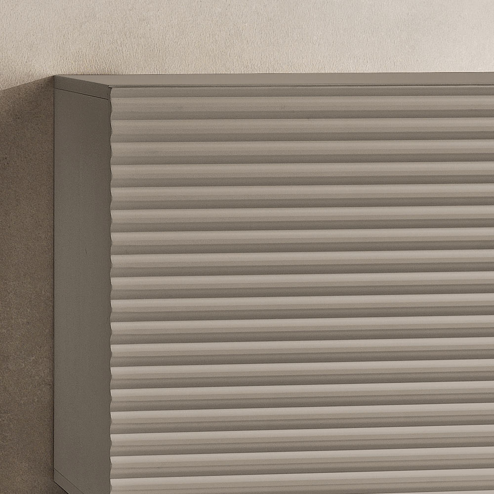 Le ante in MDF rivestito in PVC sono caratterizzate da un disegno a righe orizzontali in rilievo che dona profondità e movimento alla superficie, creando un elegante effetto grafico. La scocca in nobilitato in tinta completa il design con un raffinato effetto tono su tono, rendendo la composizione armoniosa e moderna.