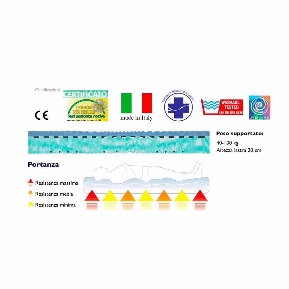Per questo motivo si consiglia l’utilizzo di questo materasso, certificato come Dispositivo medico di classe I, abbinato ad una fodera appositamente progettata con alloggio integrato per topper.