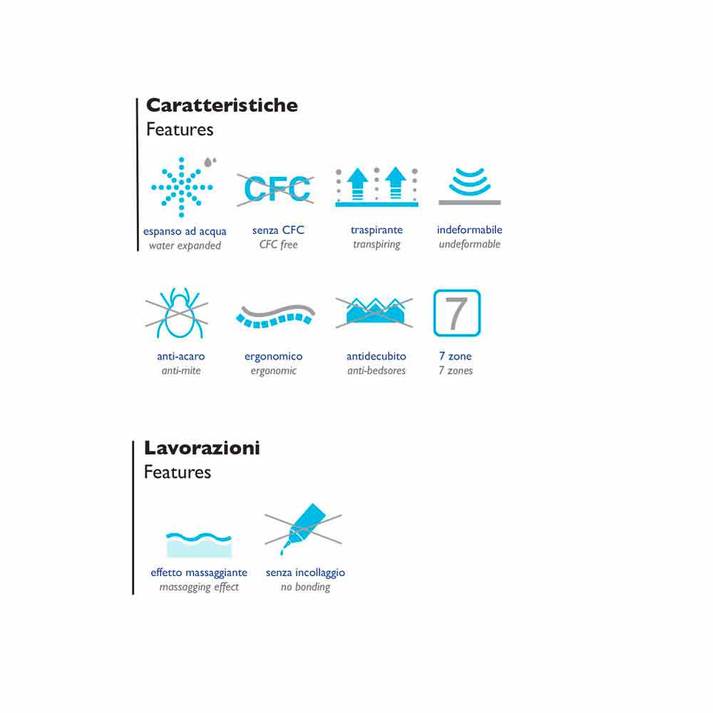 La miglior traspirazione è garantita anche dal particolare profilo e dai fori che legano il Memory allo strato di schiuma “Natura” che sostiene in modo corretto ed efficace il peso corporeo, anche questo sagomato nella parte inferiore per facilitare l’utilizzo di questo prodotto su reti meccanizzate.