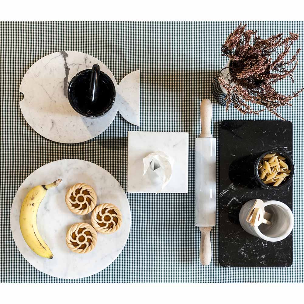 Mattarello moderno realizzato in 3 varianti di marmo: marmo bianco di Carrara, marmo grigio Bardiglio e marmo Paonazzo. Il marmo utilizzato è pregiato e di alta qualità. Si tratta di un pezzo unico in quanto ogni blocco di marmo utilizzato si differenzia dagli altri per venature e sfumature.
