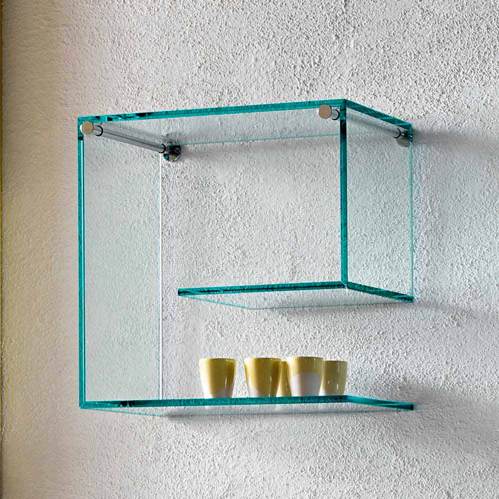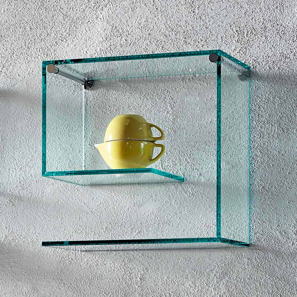 Questa coppia di mensole a parete si caratterizza per il suo design versatile e geometrico interamente realizzato in vetro float spesso 10 mm nella finitura trasparente.