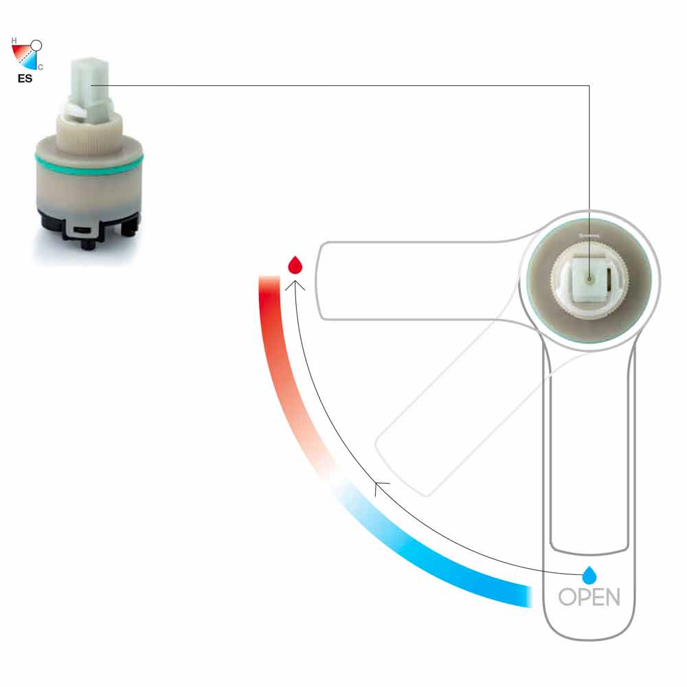 ES fornisce acqua fredda quando si alza la leva in posizione centrale evitando così la richiesta di acqua calda alla caldaia permettendo così un conseguente risparmio di energia.
