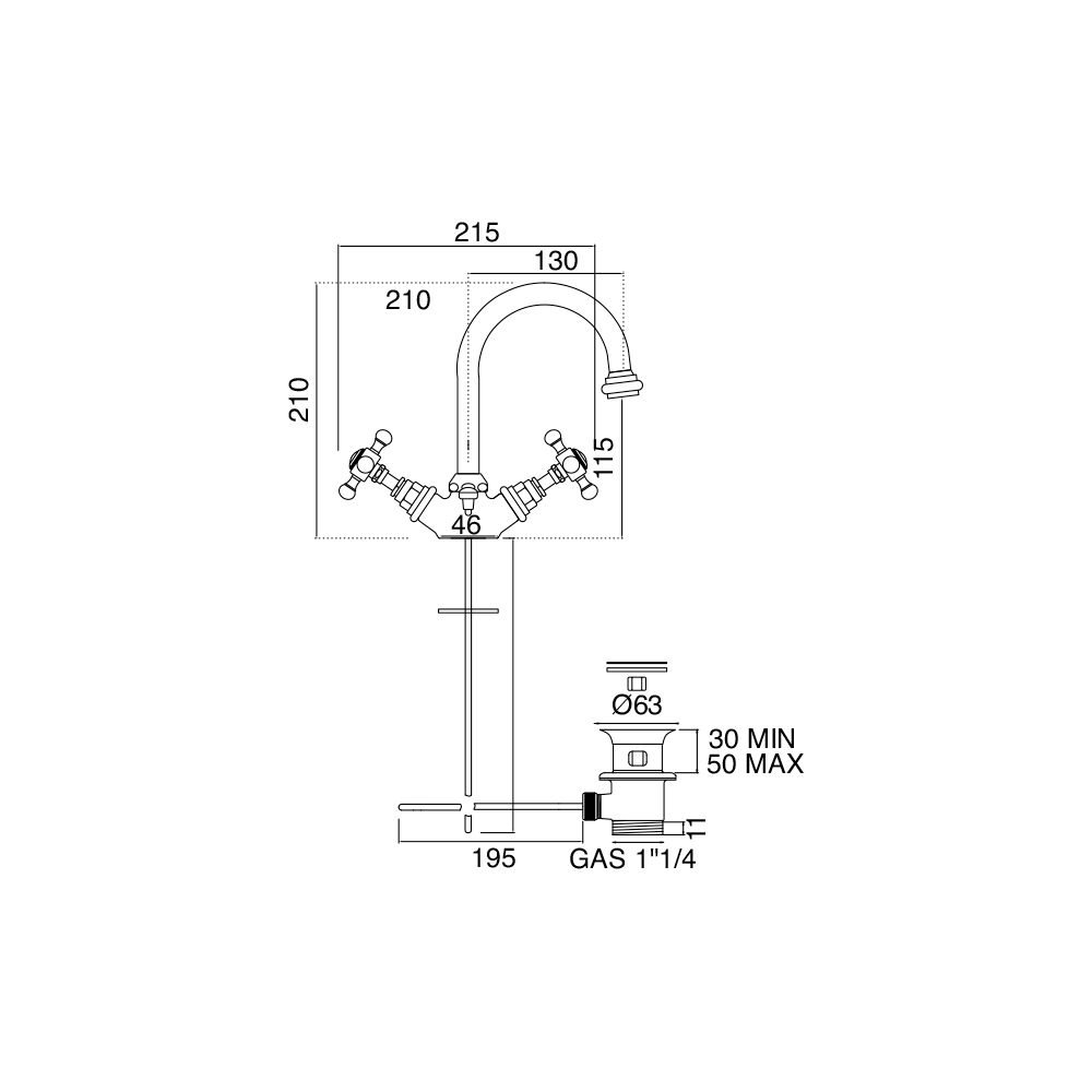 miscelatore per lavabo monoforo con scarico, realizzato in ottone.