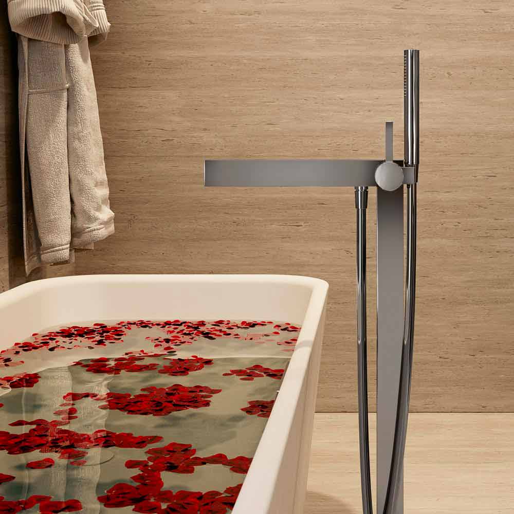 Miscelatore monocomando moderno per vasca da bagno realizzato in ottone finitura cromata.