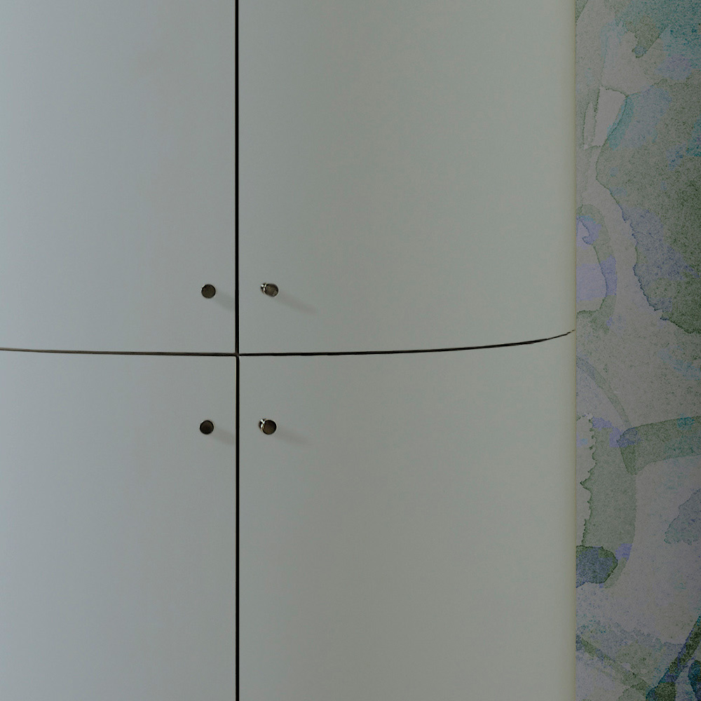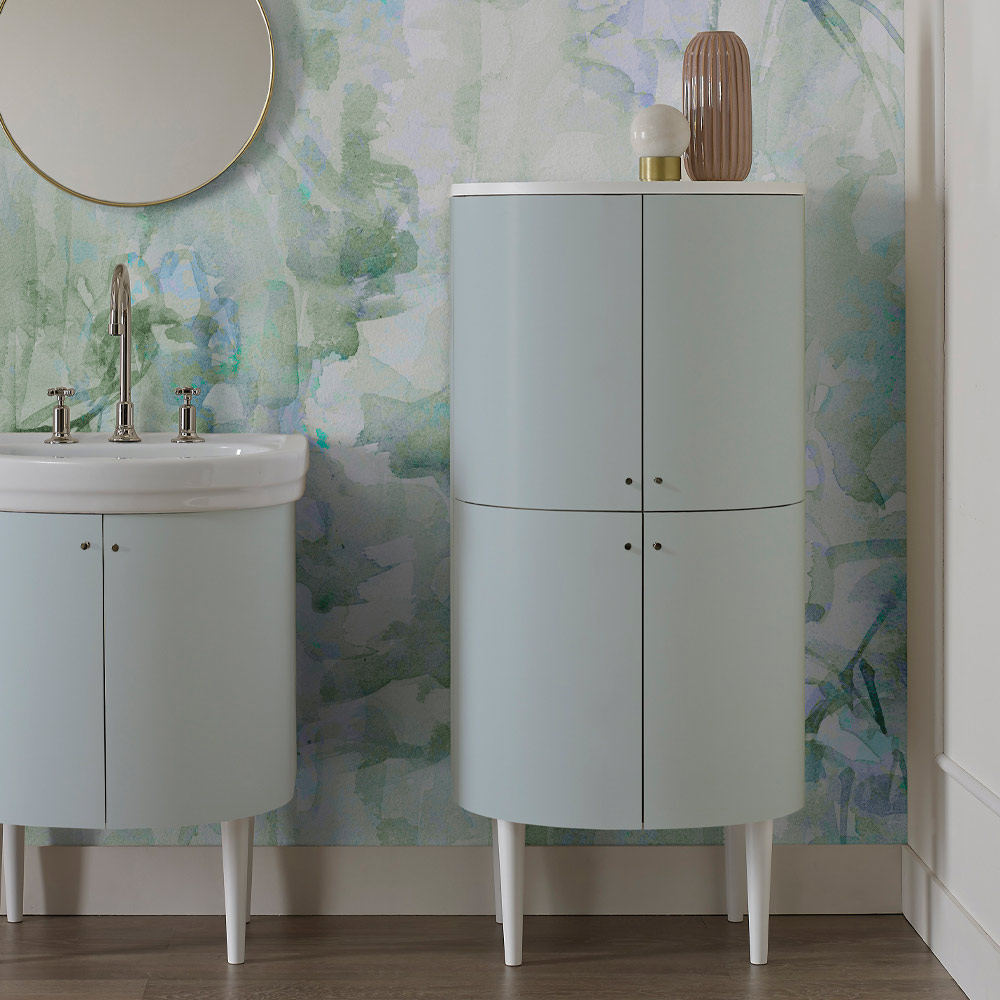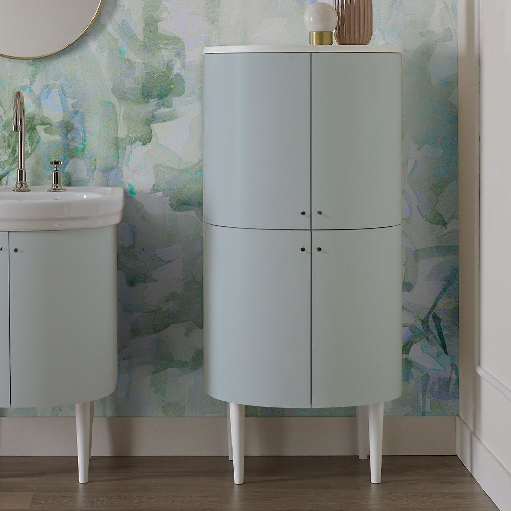 Colonna in MDF con quattro ante finitura matt color celeste che chiudono tre ripiani, di cui due in vetro e uno in MDF Idro. Il ripiano superiore e le gambe sono in finitura matt colore bianco e i pomelli sono inclusi in finitura nichel.