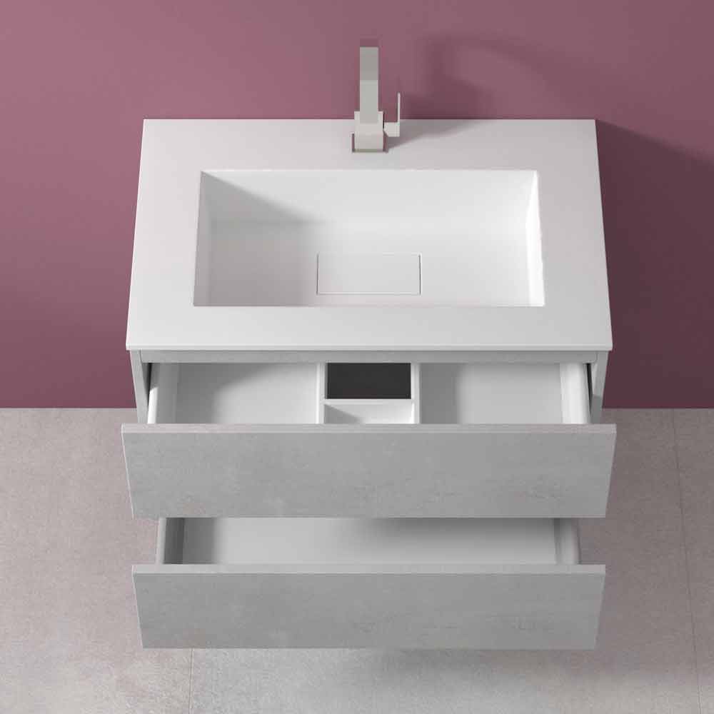 La base lavabo con cassetto e cassetto sagomato è realizzata in fibra di legno idro W 100 laminato e idrorepellente, al fine di garantire una maggior durata nel tempo ed evitare che il mobile si rovini a contatto con l'acqua.