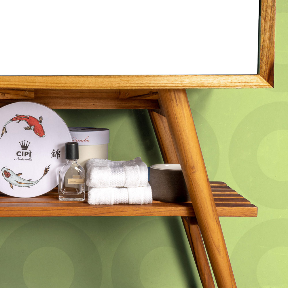 Questo complemento per la zona bagno si caratterizza per la purezza delle linee e per la finitura di grande ricercatezza e vuole sottolineare il design contemporaneo della lavorazione del legno riciclato che continua a vivere all'interno della casa portando con sè profumi esotici e sensazioni raffinate. Il suo design garantisce ampi e pratici spazi per l'organizzazione del proprio ambiente contribuendo a far sembrare la zona bagno più ariosa. È un progetto pensato attraverso geometrie di linee orizzontali e colori vivaci per realizzare soluzioni d'arredo esclusive anche da un punto di vista estetico.