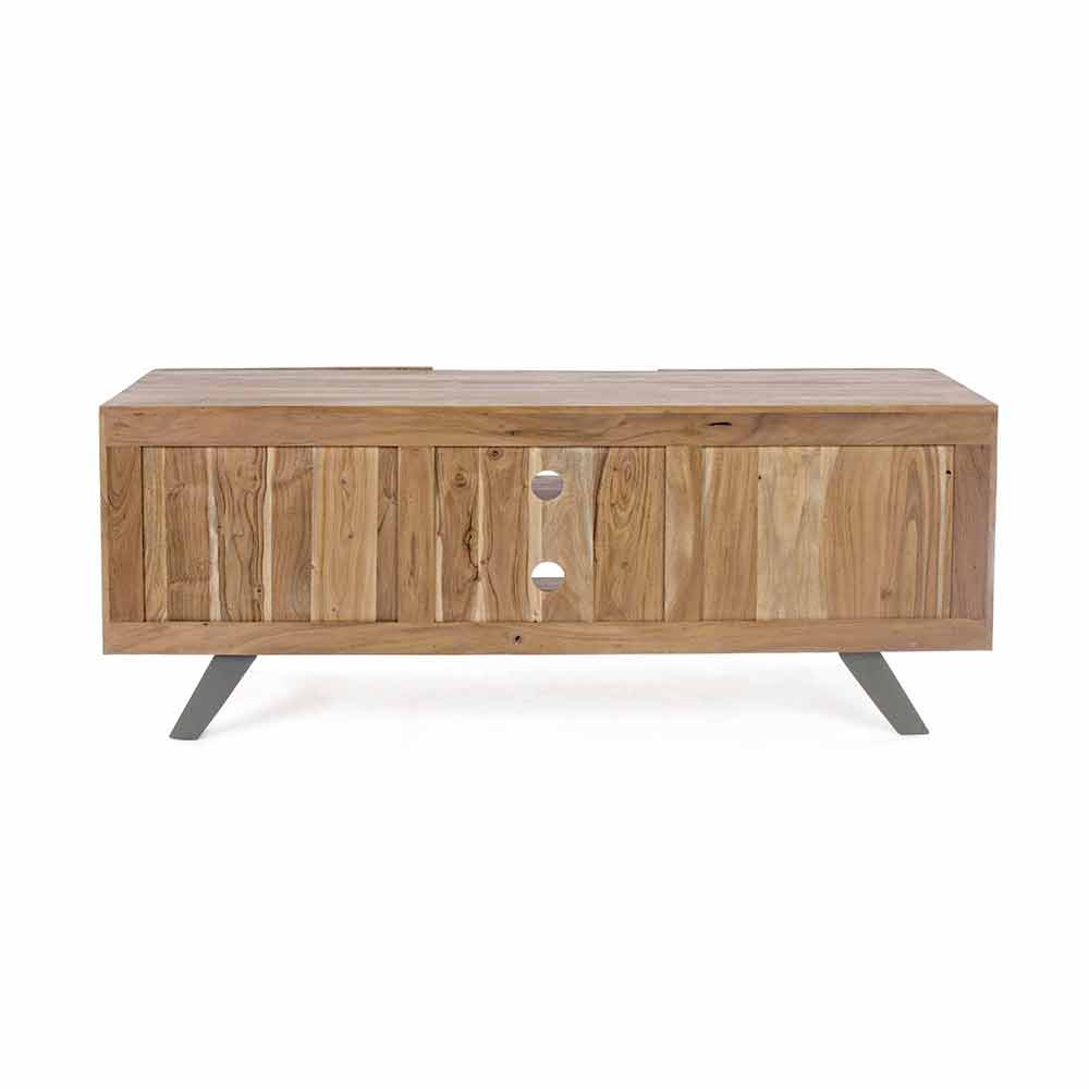 Mobile porta tv con struttura in legno di mango e inserti in metallo.