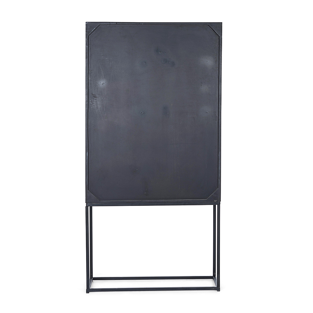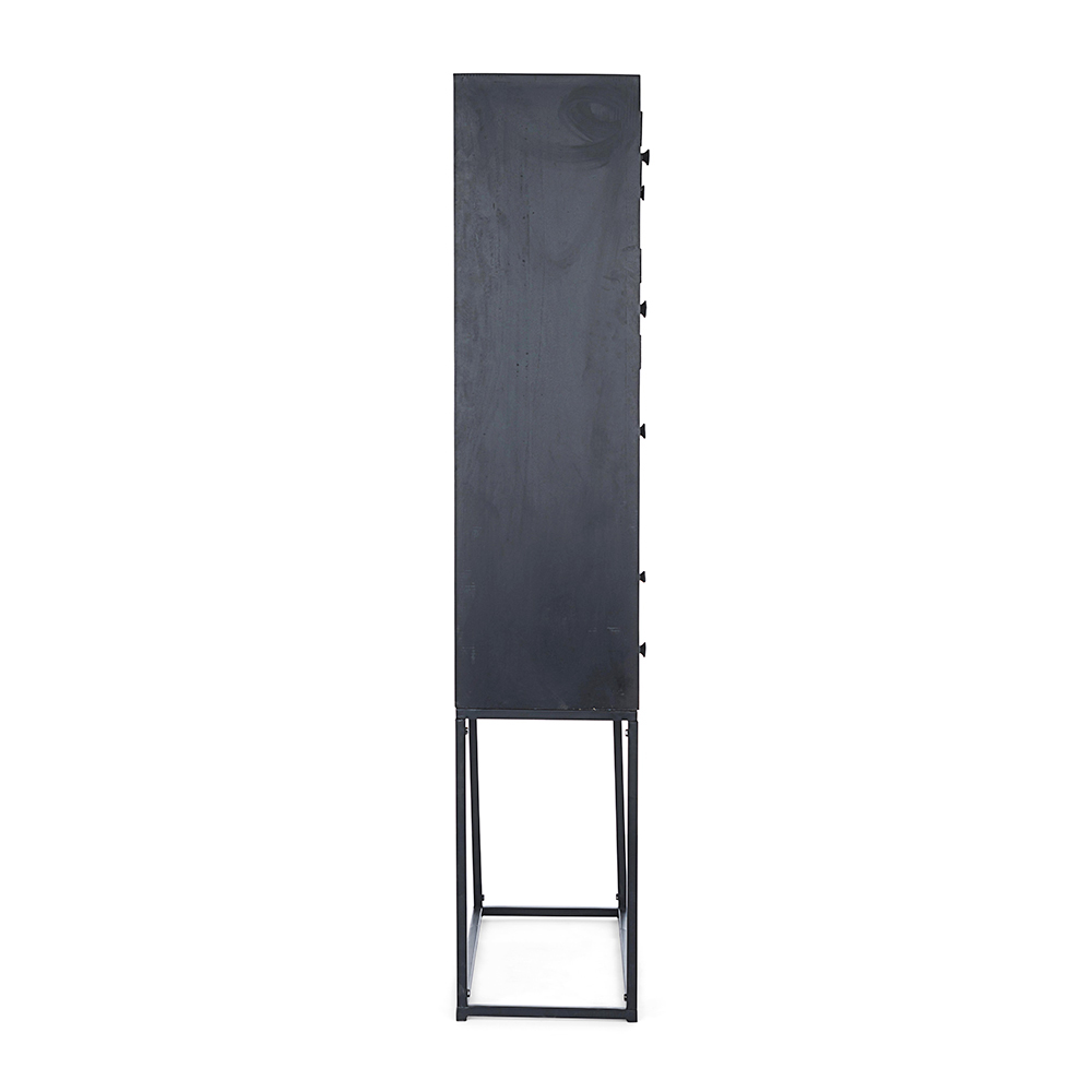 Questa madia di design per il soggiorno presenta una struttura in legno di mango con schienale, ante e cassetti in mdf e pomelli in acciaio.