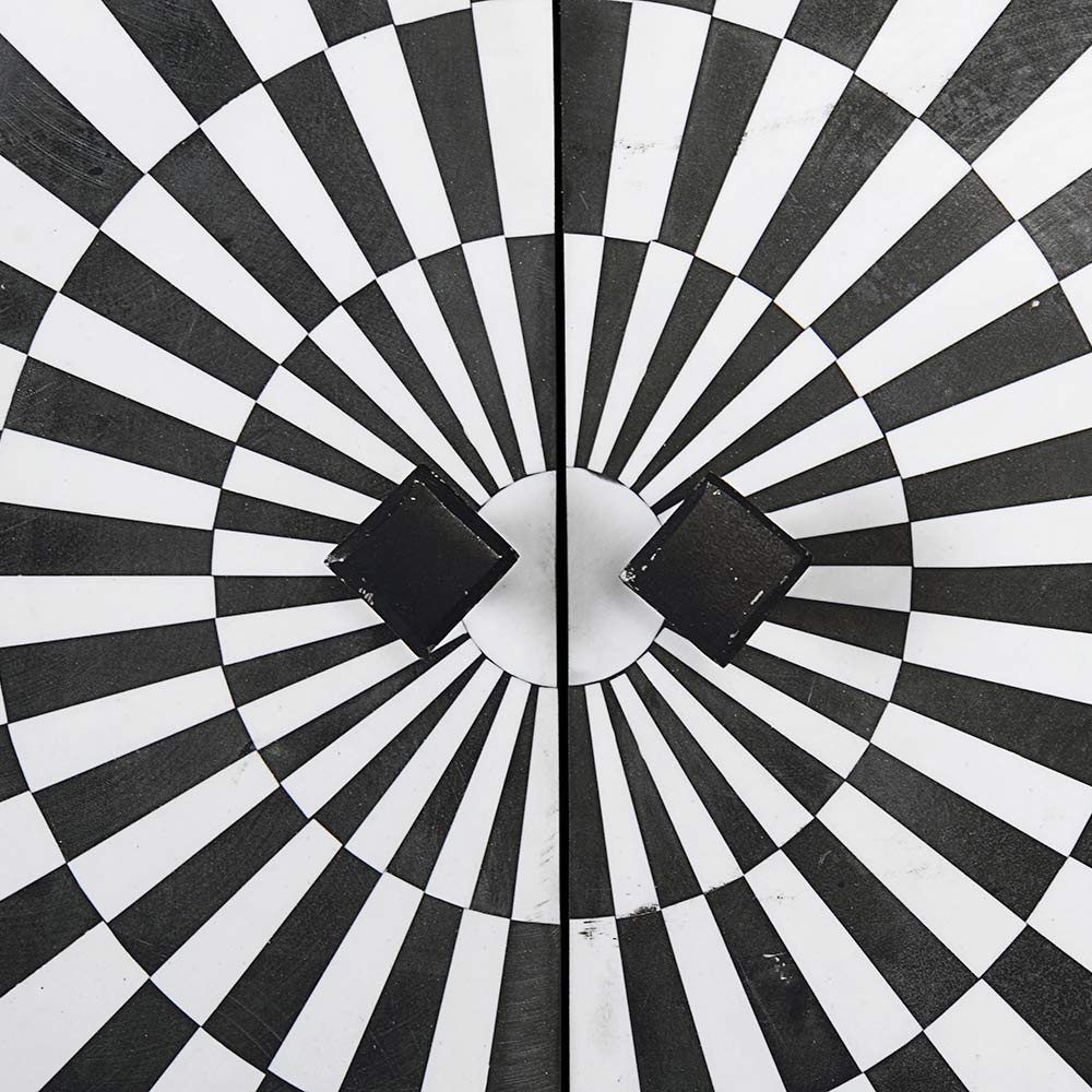 Le 4 ante e i 6 cassetti sono realizzati con lavorazione a mosaico mediante l'utilizzo di piccoli tasselli in resina con finitura a base di nitrocellulosa.