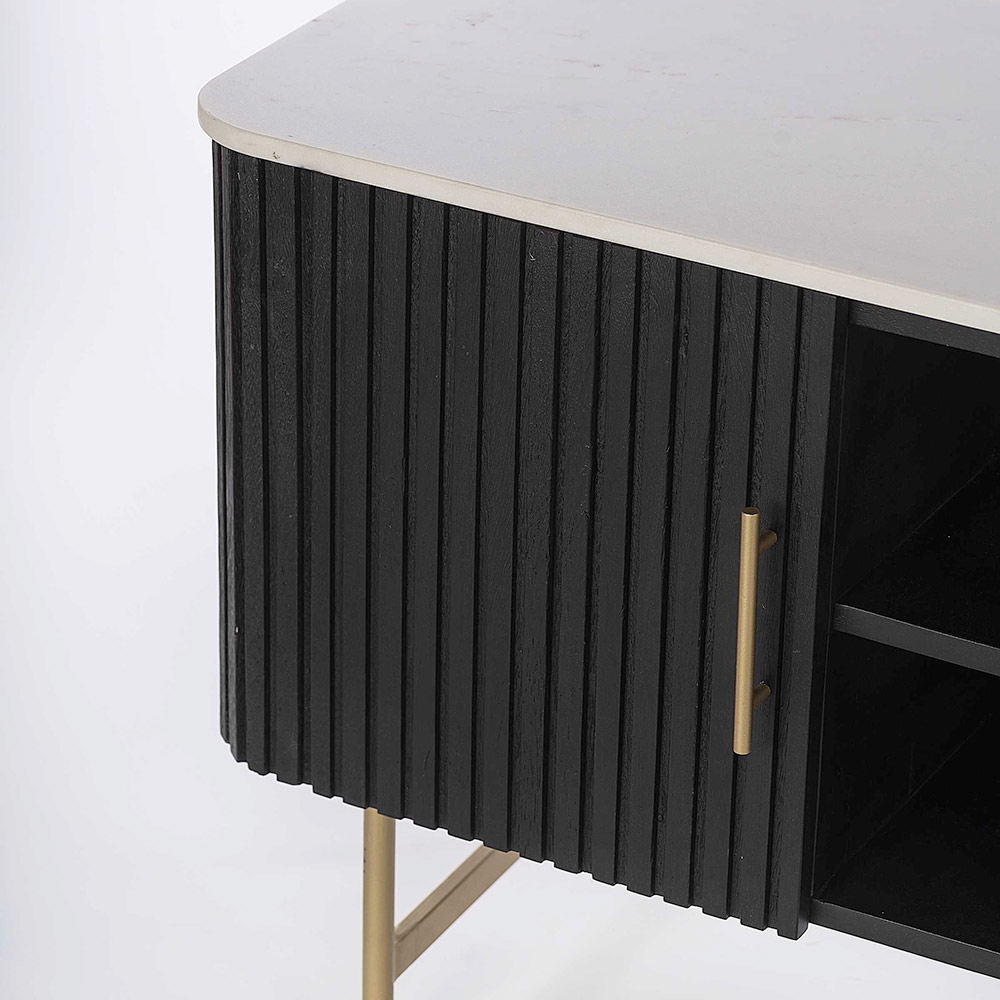 Questo mobile porta TV è l'essenza dell'eleganza contemporanea, unendo design moderno e funzionalità. La struttura in legno nero scanalato regala un effetto tridimensionale sofisticato, perfettamente bilanciato dal top liscio che aggiunge un tocco raffinato. Le gambe in metallo dorato, sottili ma robuste, conferiscono leggerezza visiva e garantiscono stabilità.