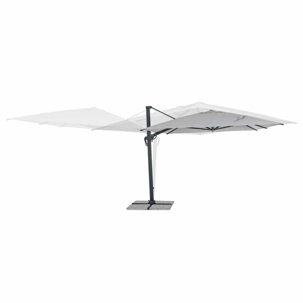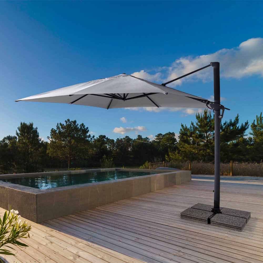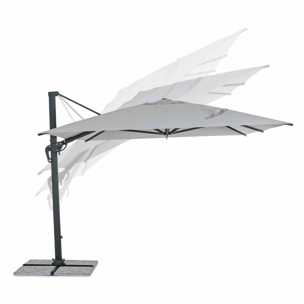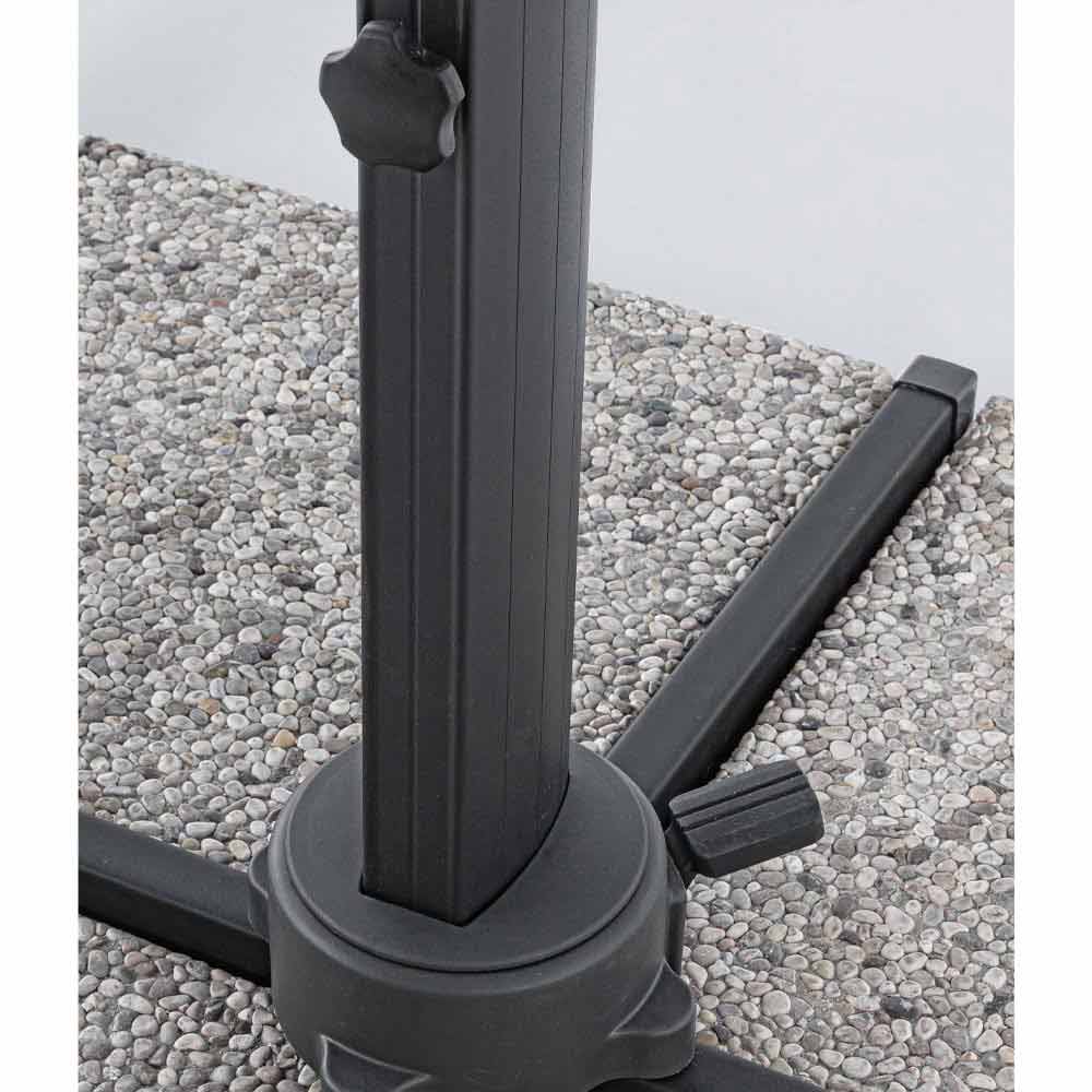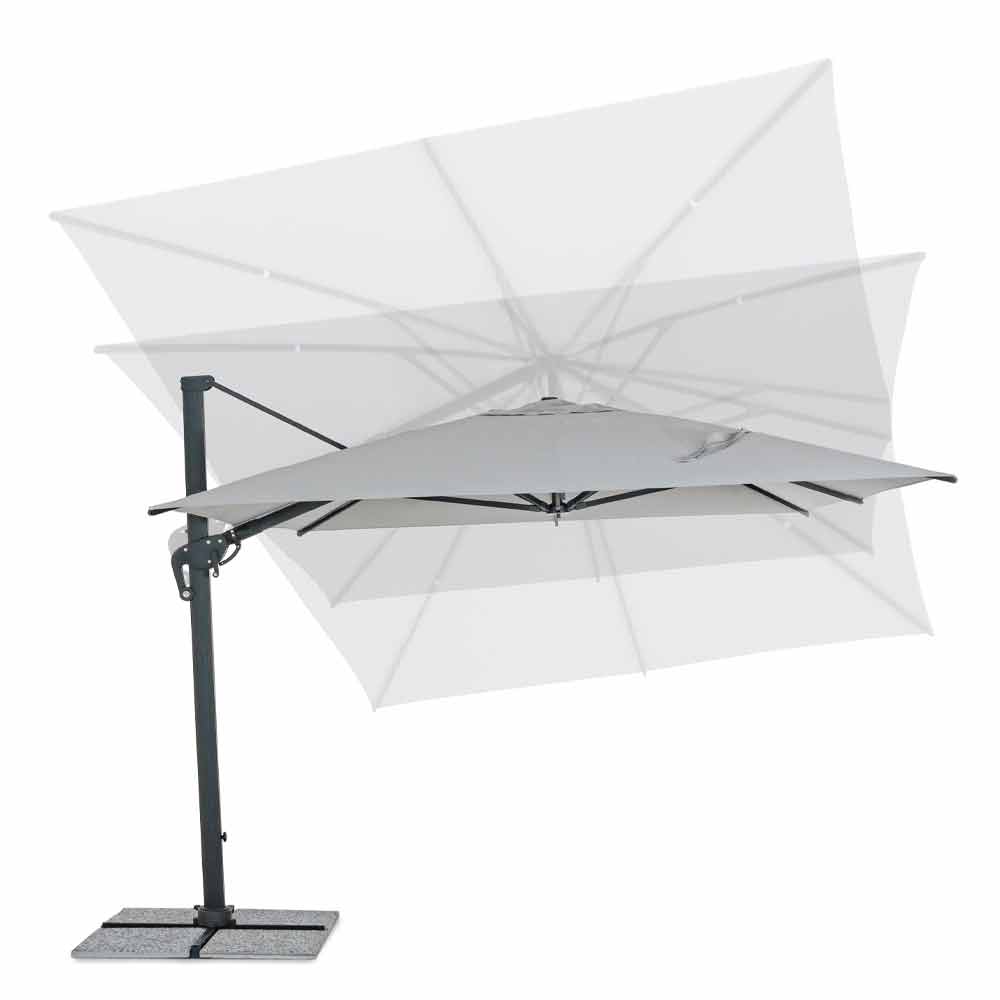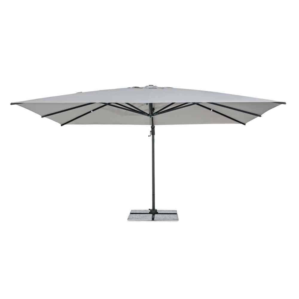 Struttura in alluminio verniciata a polvere(poliestere). Palo 93x57mm. 8 stecche 28x18mm. Telo grigio chiaro in poliestere 250gr/m2 con rivestimento in pa (poliammide). Base a croce in acciaio. Palo girevole 360° con pedalina.Inclinazione verticale con impugnatura a 5 posizioni. Dotato di maniglia per inclinazione ombrello destra-sinistra.