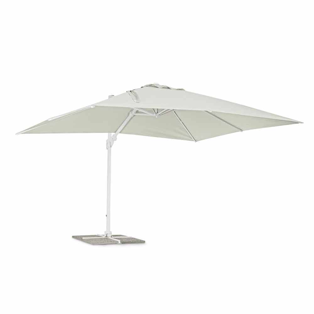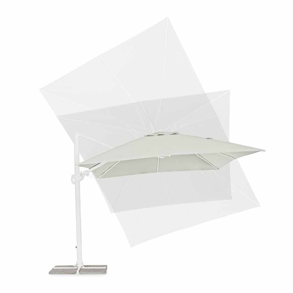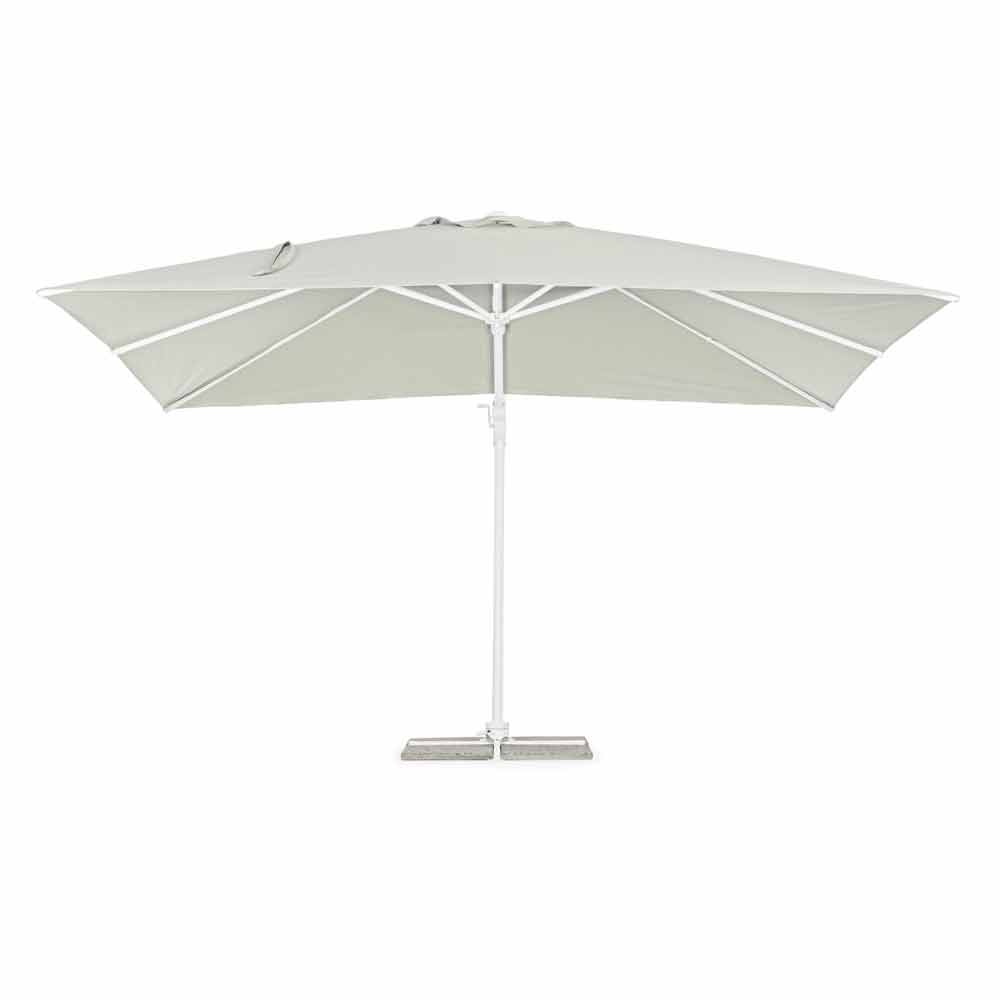 Struttura in alluminio verniciata a polvere (poliestere). Palo 90x60mm, 8 stecche 25x17mm, telo color naturale in poliestere 250gr/m2 con rivestimento in pa (poliammide), base a croce in acciaio, palo girevole 360° con pedalina. Inclinazione verticale con impugnatura a 5 posizioni, dotato di sistema per inclinazione ombrello destra-sinistra.