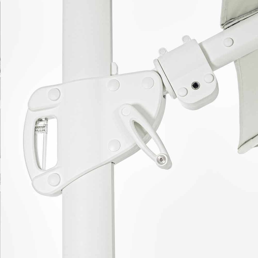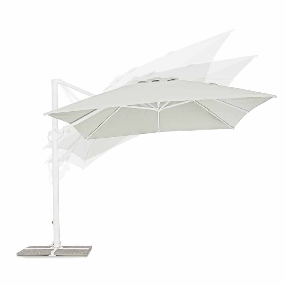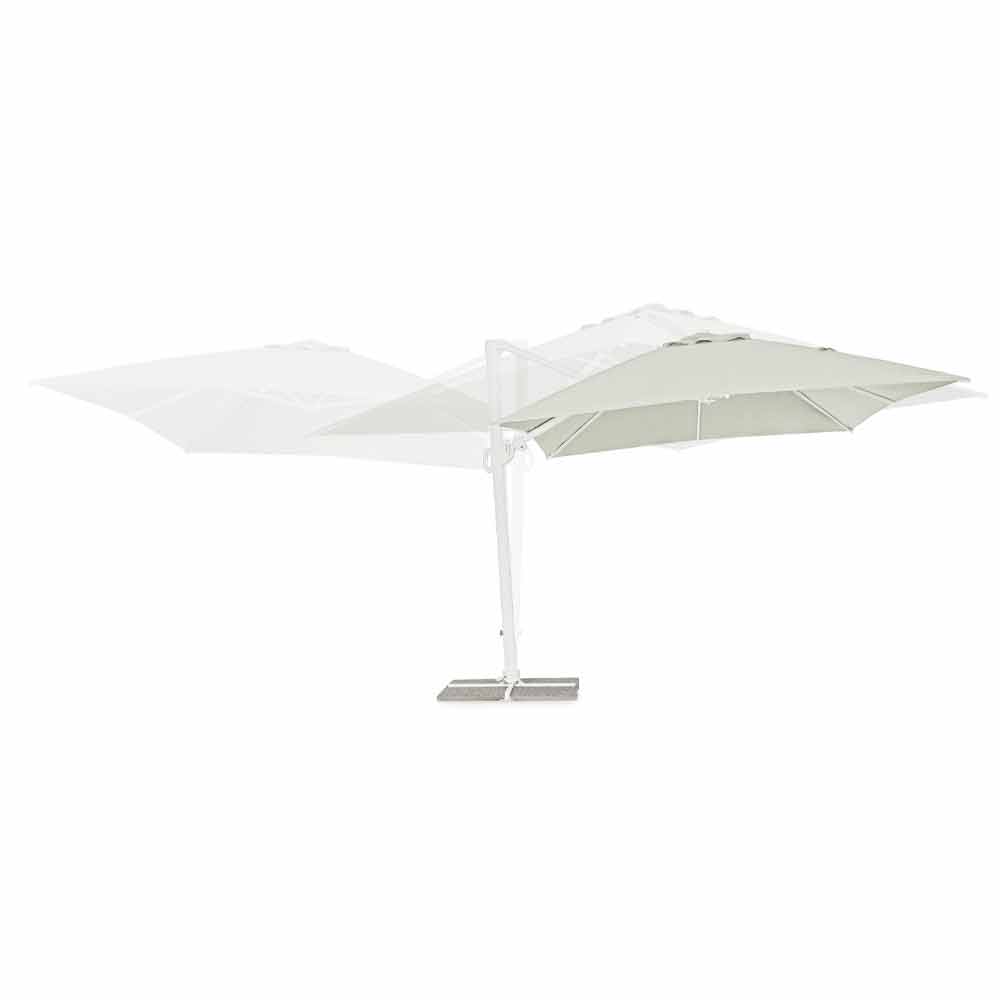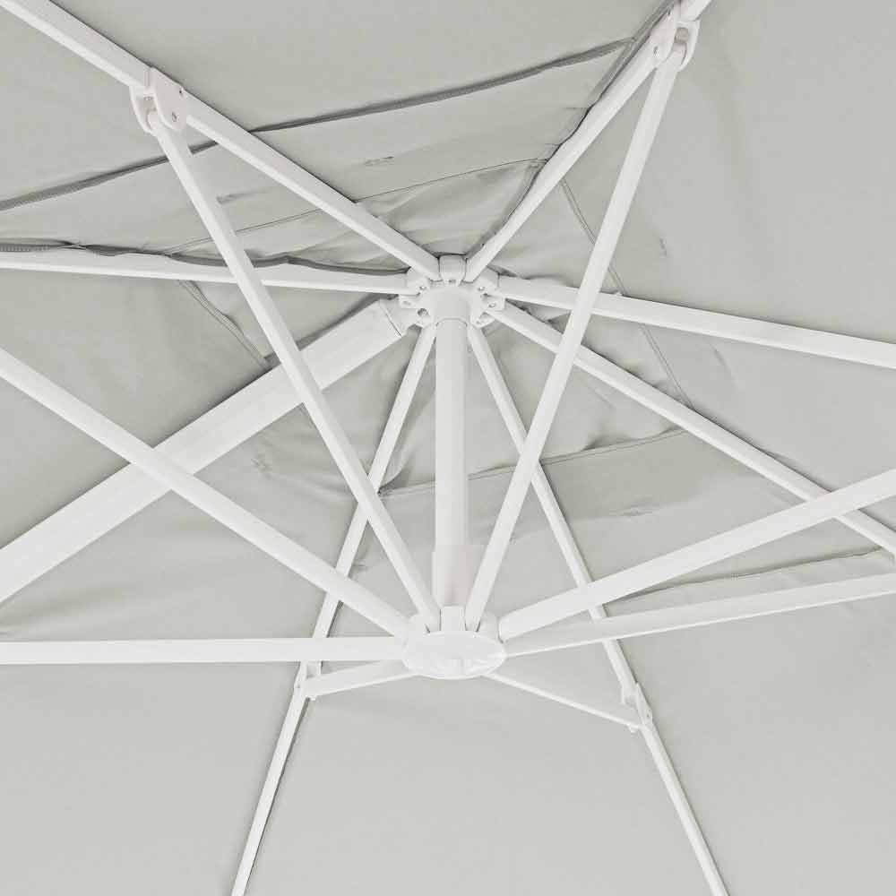 Struttura in alluminio verniciata a polvere (poliestere). Palo 90x60mm, 8 stecche 25x17mm, telo color naturale in poliestere 250gr/m2 con rivestimento in pa (poliammide), base a croce in acciaio, palo girevole 360° con pedalina. Inclinazione verticale con impugnatura a 5 posizioni, dotato di sistema per inclinazione ombrello destra-sinistra.