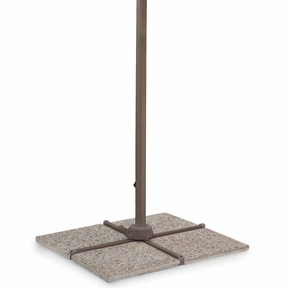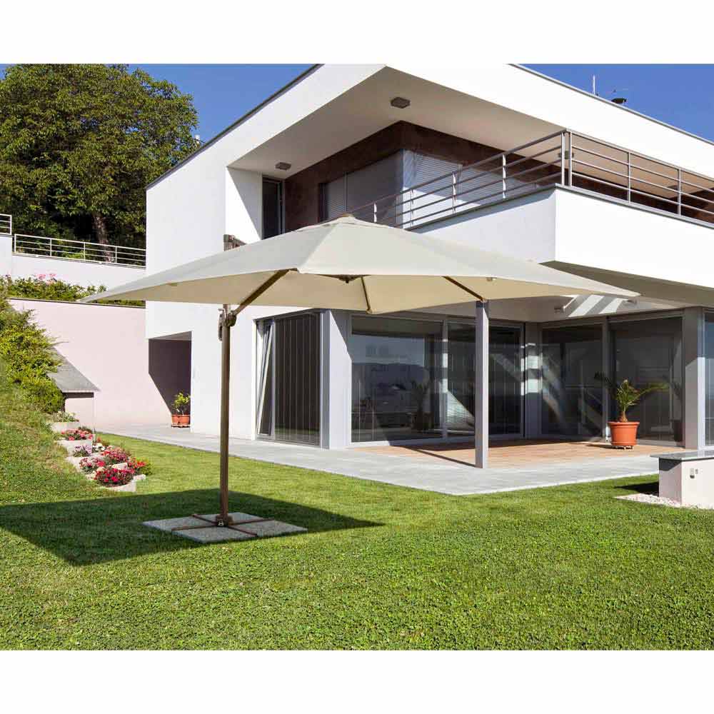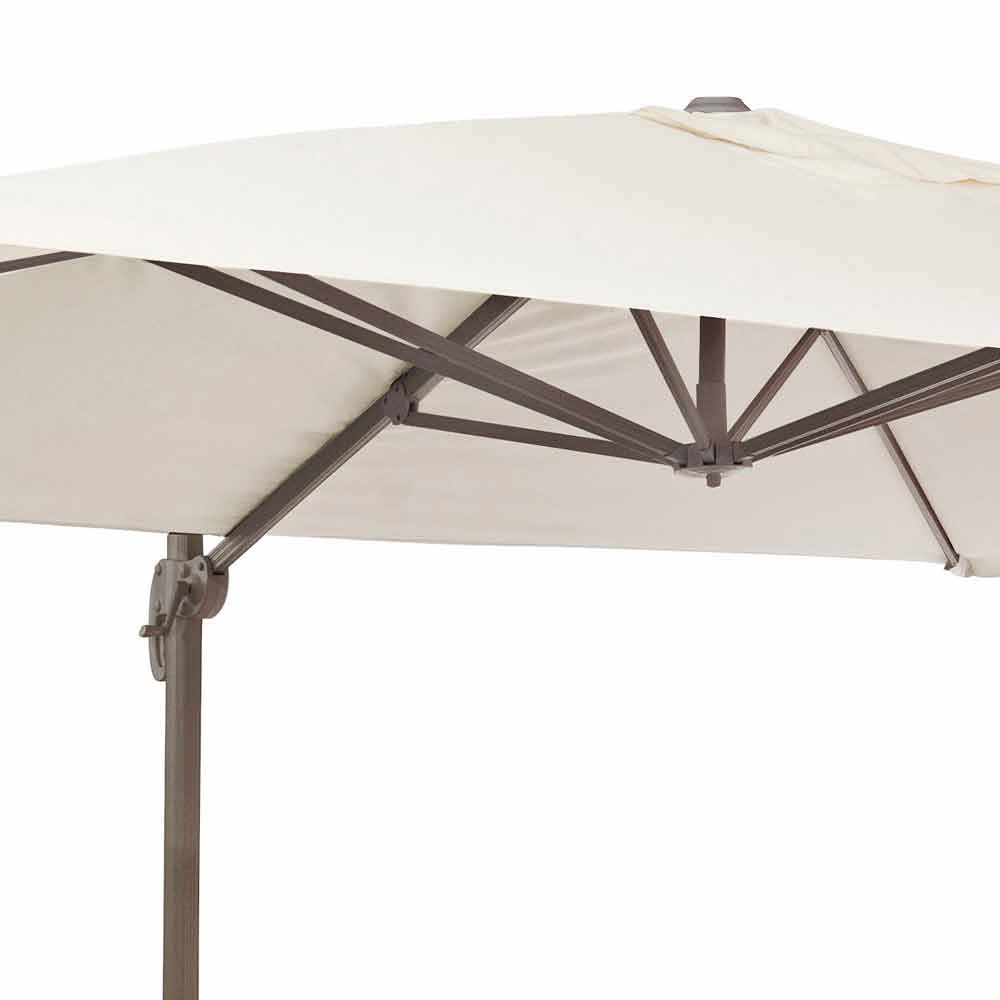 Struttura in alluminio verniciata a polvere(poliestere). Palo 53x77mm, palo sospeso 25x40mm, 8 stecche 14x24mm. Telo naturale in poliestere 200gr/m2 con rivestimento in pa (poliammide). Base a croce in acciaio. Palo girevole 360°manualmente.
