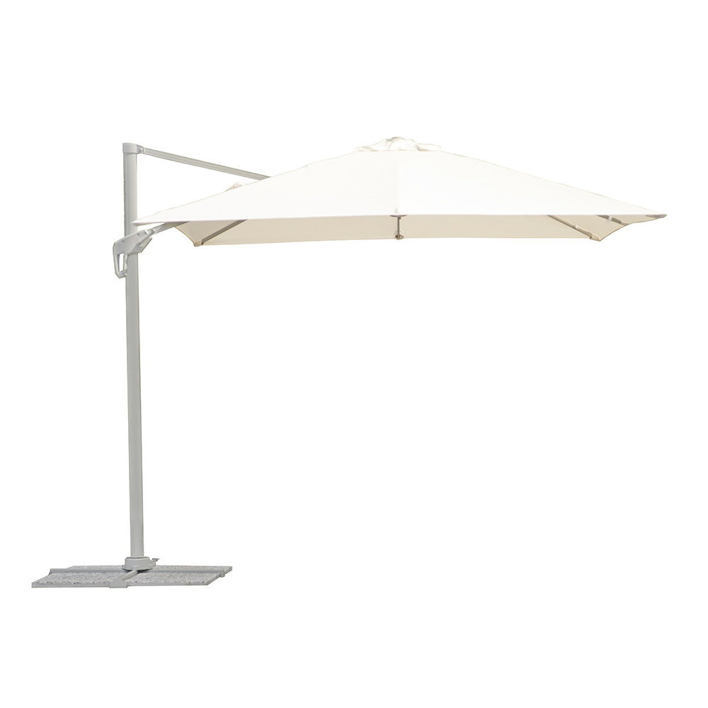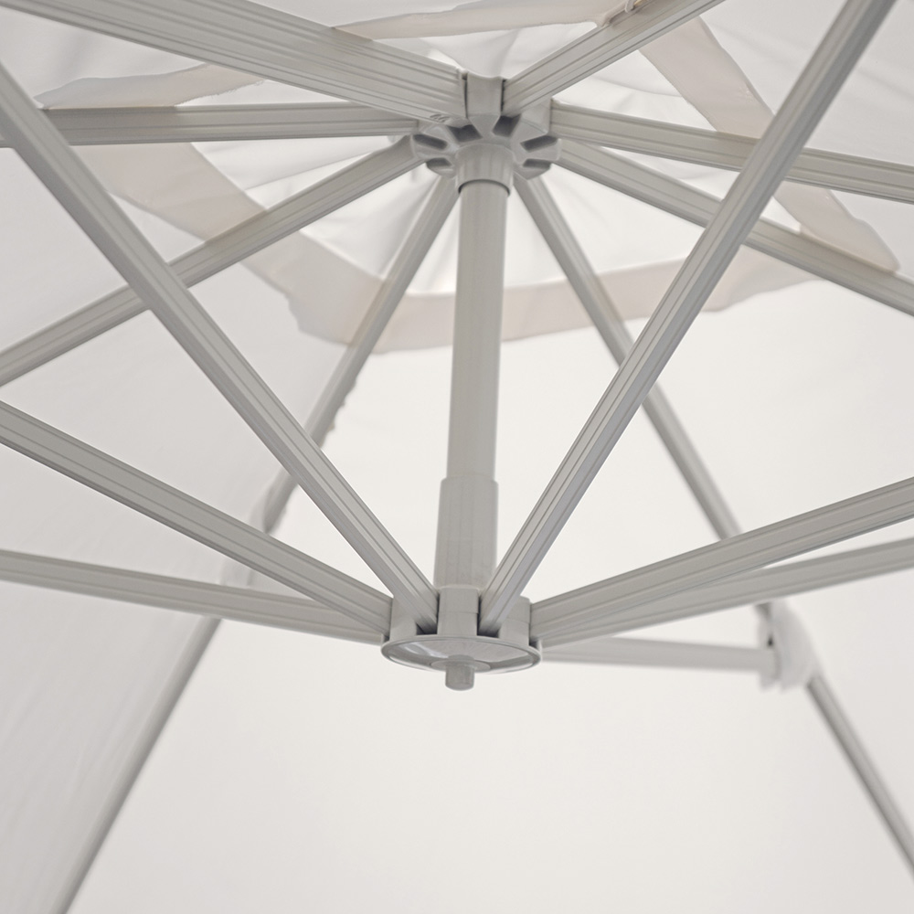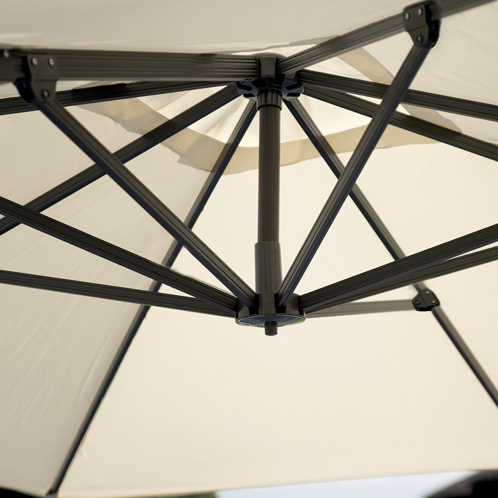 Il telo in poliestere da 250 gr color ecrù assicura un’ottima protezione dai raggi solari e resiste efficacemente alle intemperie, creando una zona d’ombra ampia e accogliente. Grazie al sistema ruotabile a 360°, l’ombrellone può essere orientato con facilità in base alla posizione del sole, offrendo sempre la massima copertura e comfort.