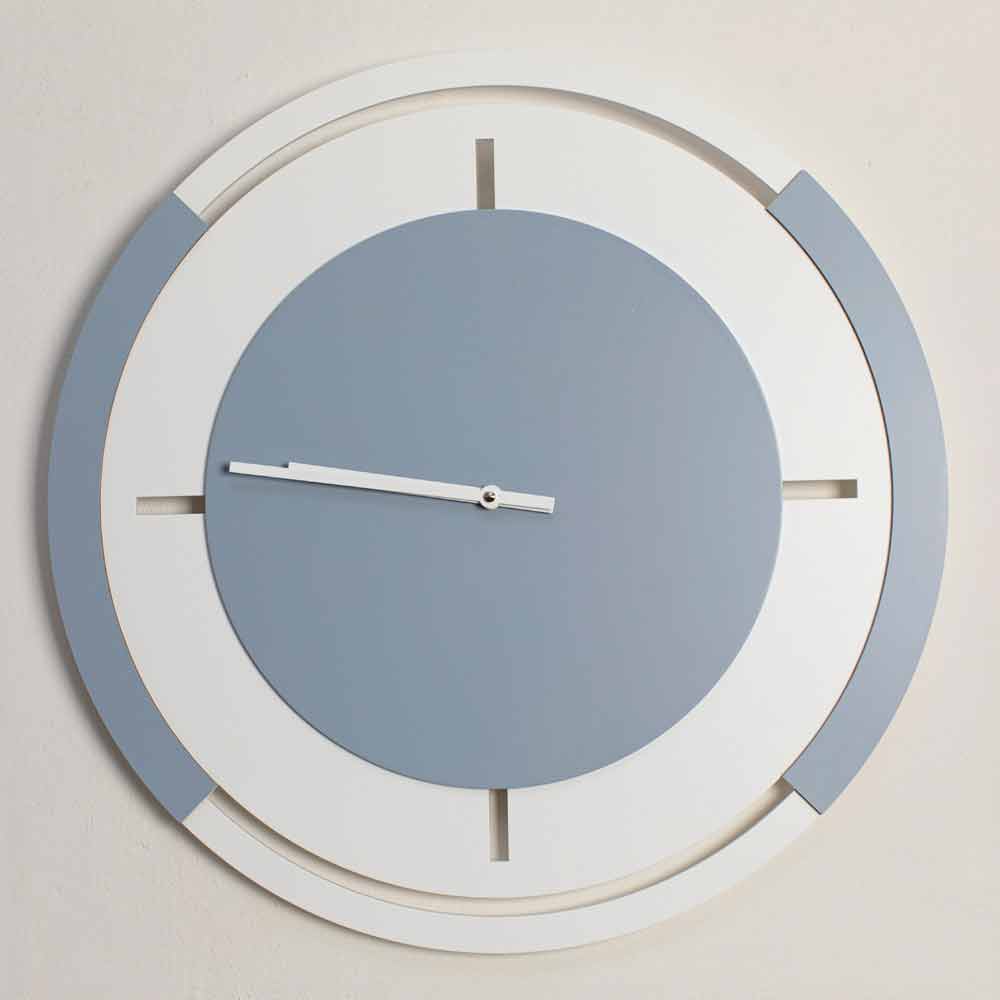 Orologio da parete tondo in legno laccato bianco e avio, design moderno made in Italy.