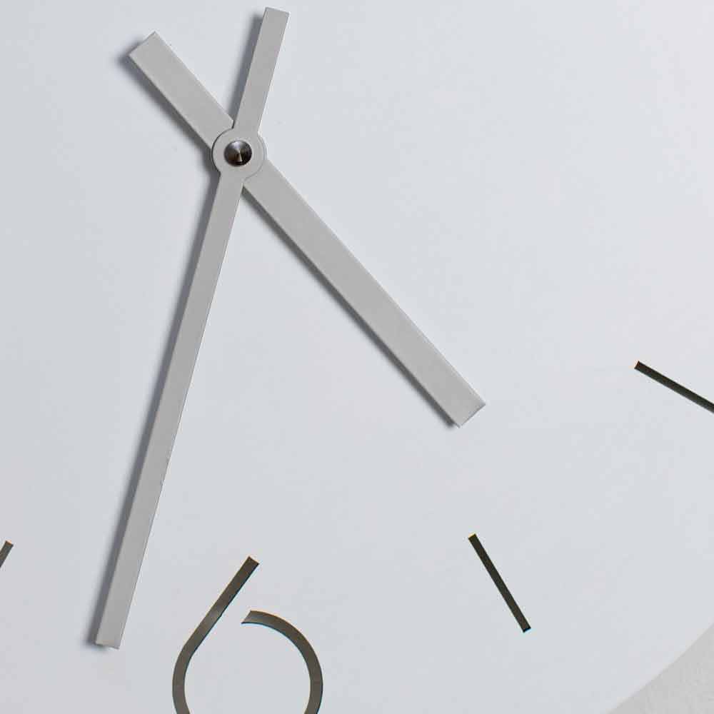 Orologio da parete di design basico e tondo in legno laccato bianco e tagliato a laser, made in Italy.