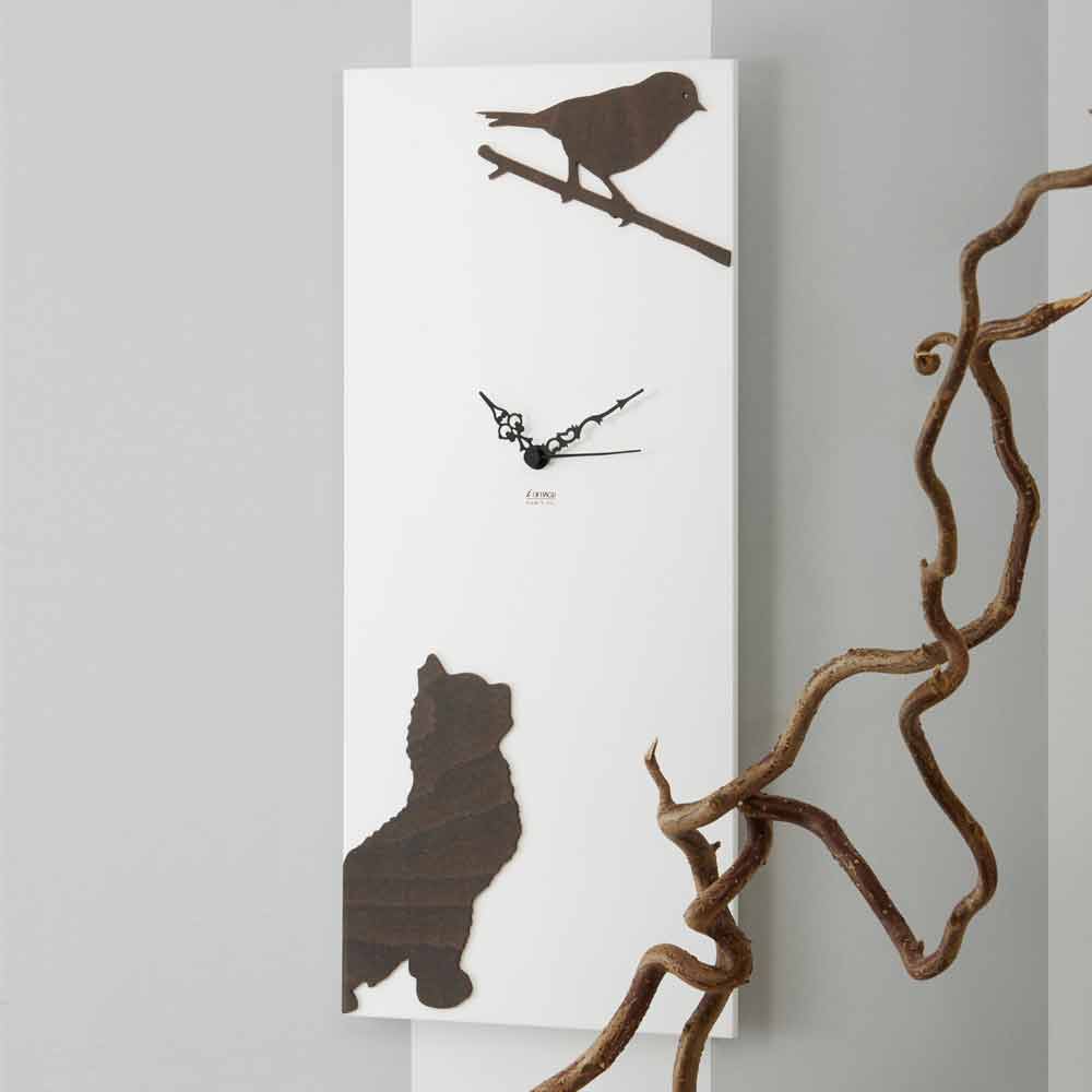 Orologio da parete rettangolare in legno bianco opaco con disegno di uccello e gatto, design moderno made in Italy.