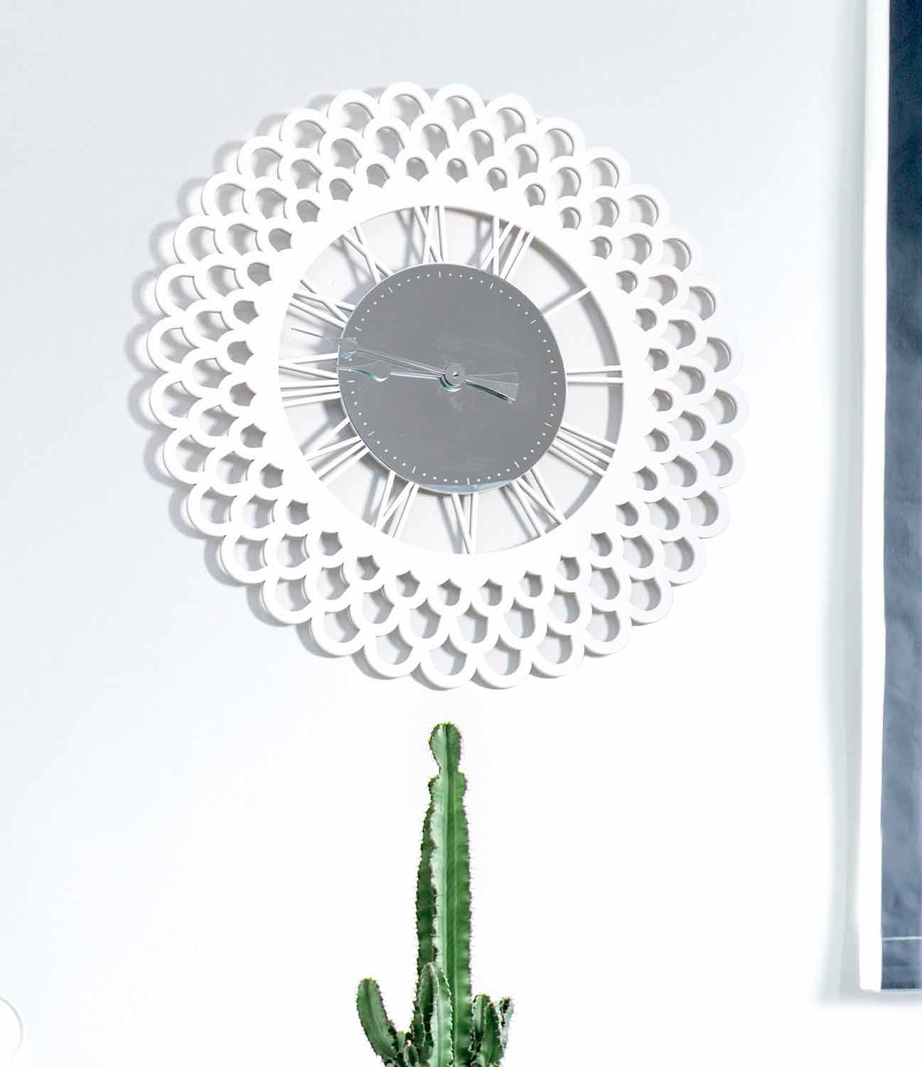 Orologio grande da parete, design in legno bianco moderno con decoro a specchio, forma floreale made in Italy.