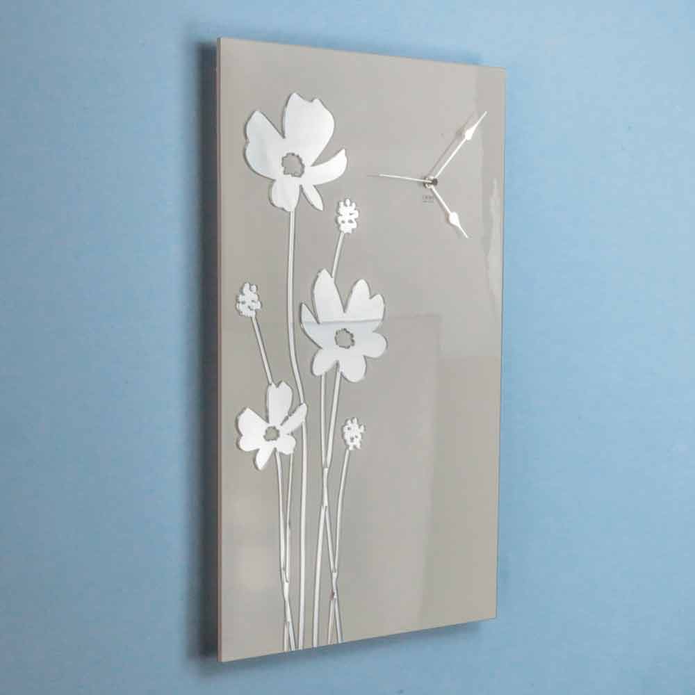 Orologio rettangolare da parete di design moderno in legno bianco con intarsi di plexiglass specchiati, made in Italy.