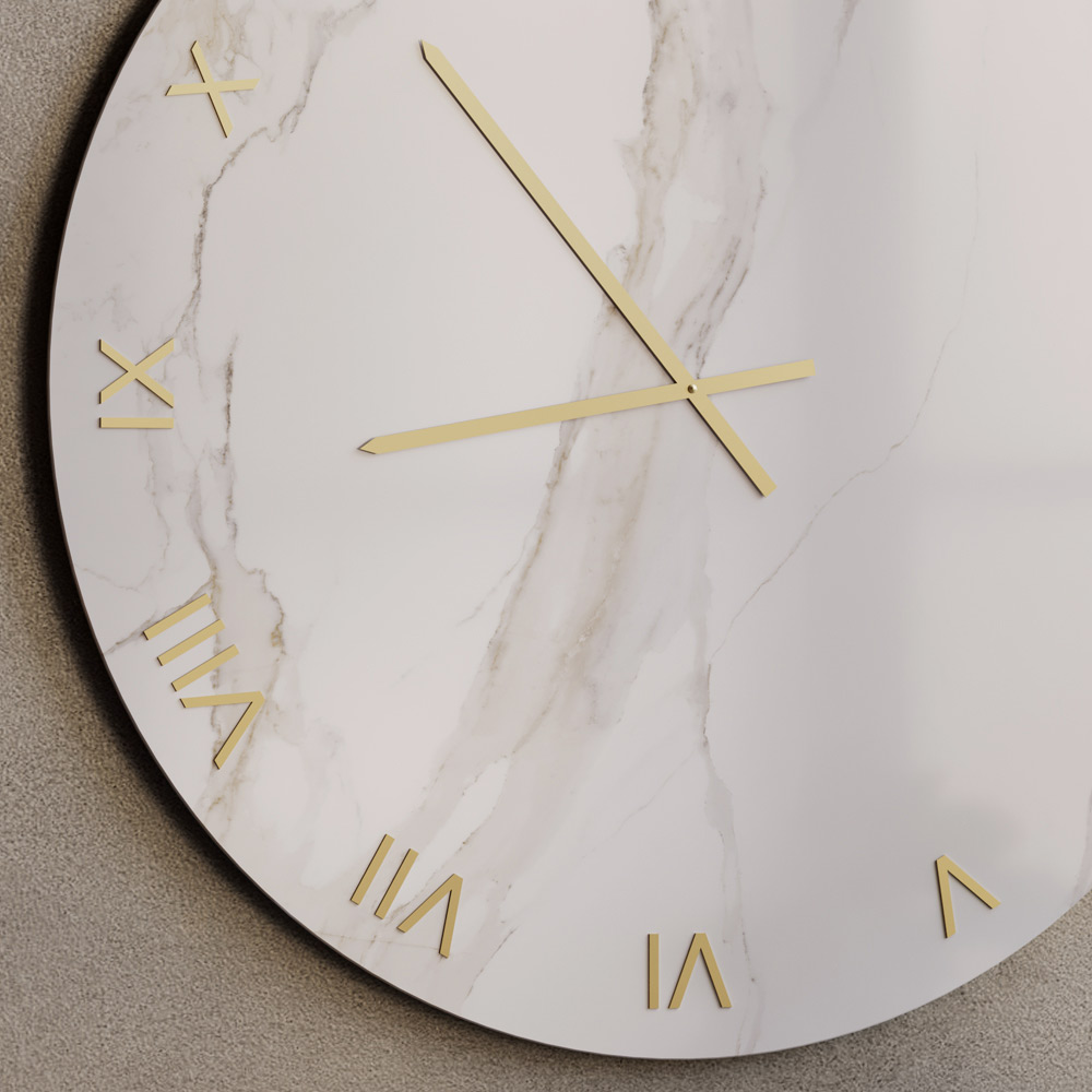 L’orologio da parete in vetro con finitura serigrafata effetto marmo Calacatta è un elemento d’arredo raffinato, pensato per impreziosire ambienti moderni e contemporanei con un tocco di lusso senza tempo. La superficie in vetro valorizza le delicate venature ispirate al marmo naturale, creando un elegante gioco di luce e profondità.