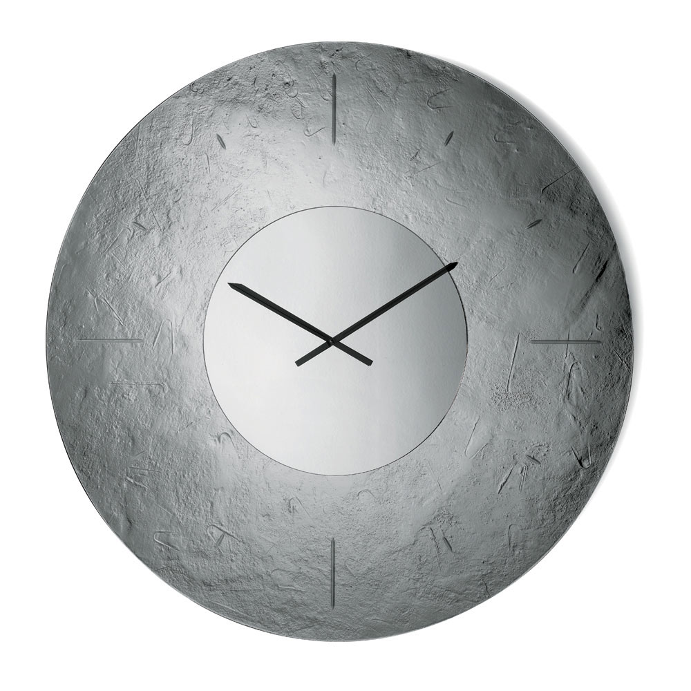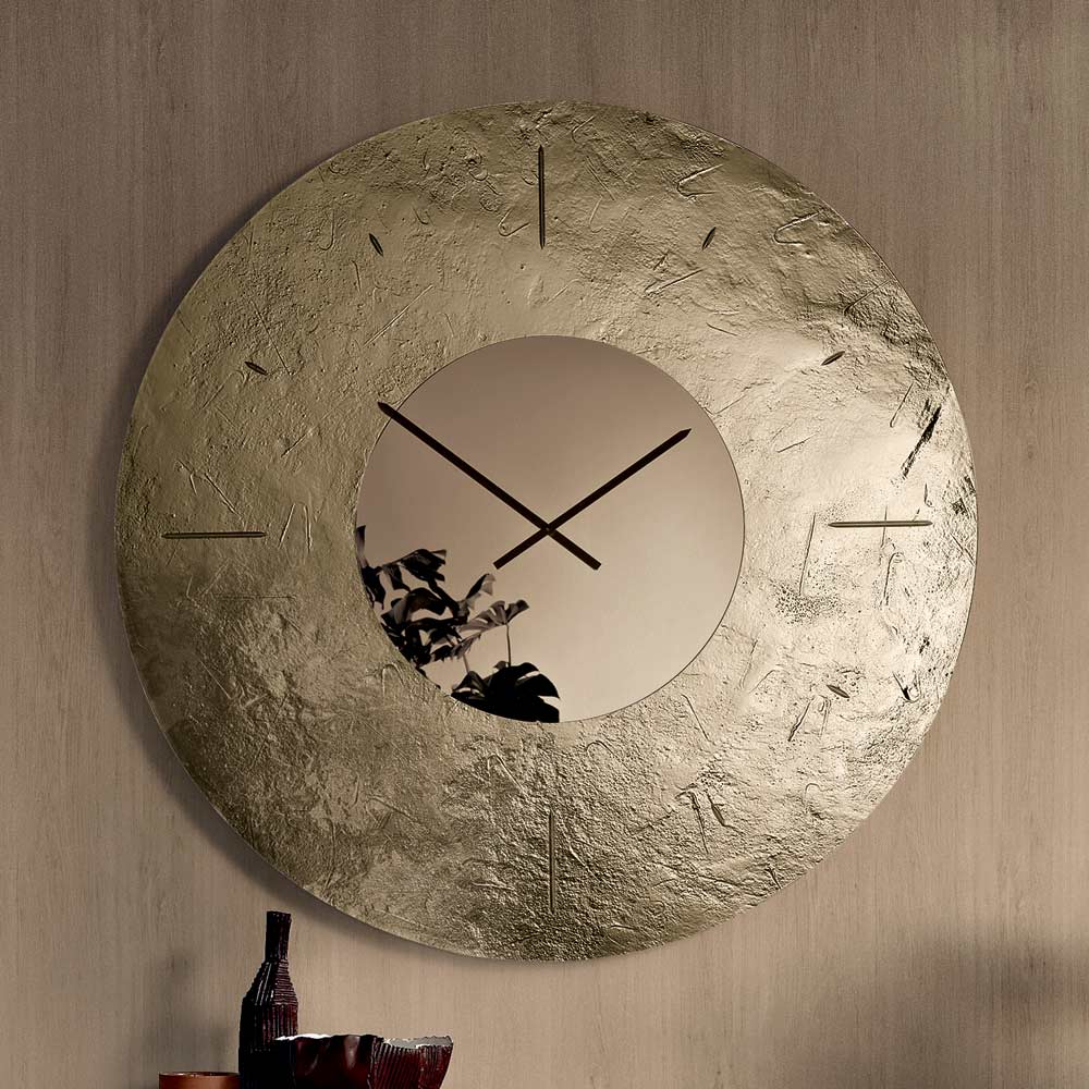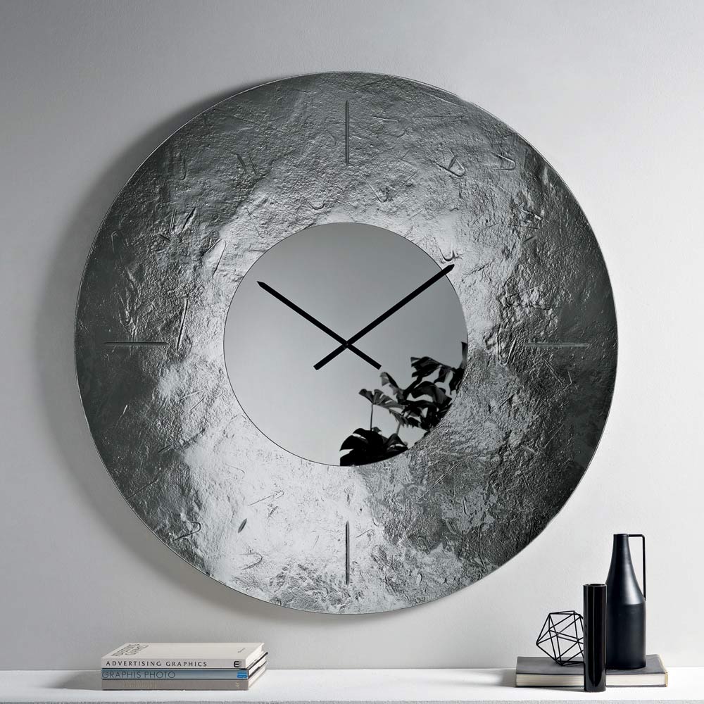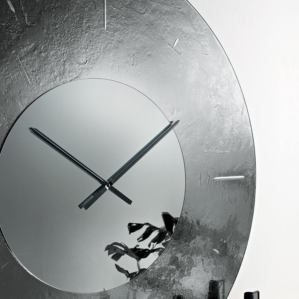 L’orologio presenta una forma tonda di grande impatto visivo, impreziosita da una cornice in vetro fuso martellato retroargentato che crea un raffinato gioco di riflessi e profondità. Al centro, un inserto specchiato tono su tono accoglie le lancette, donando equilibrio e luminosità alla composizione.
