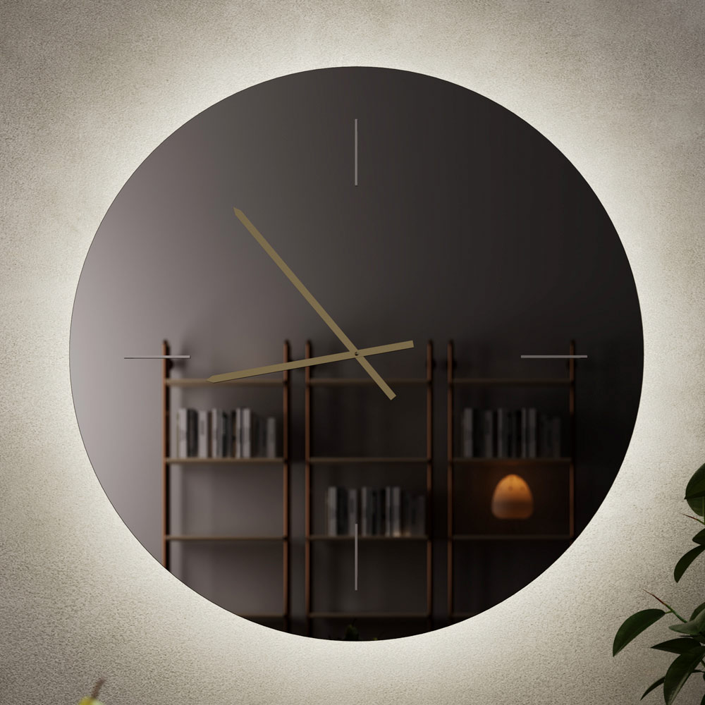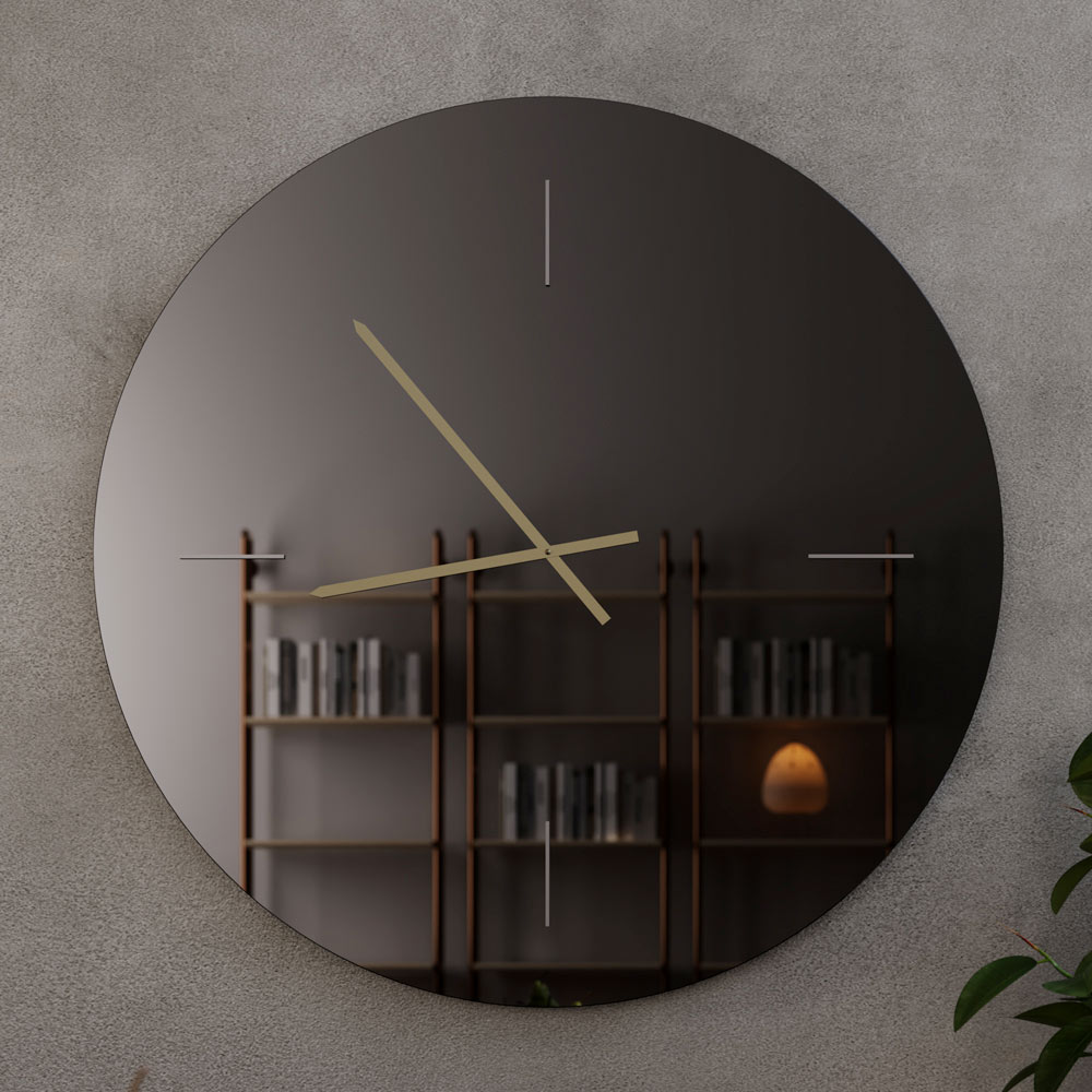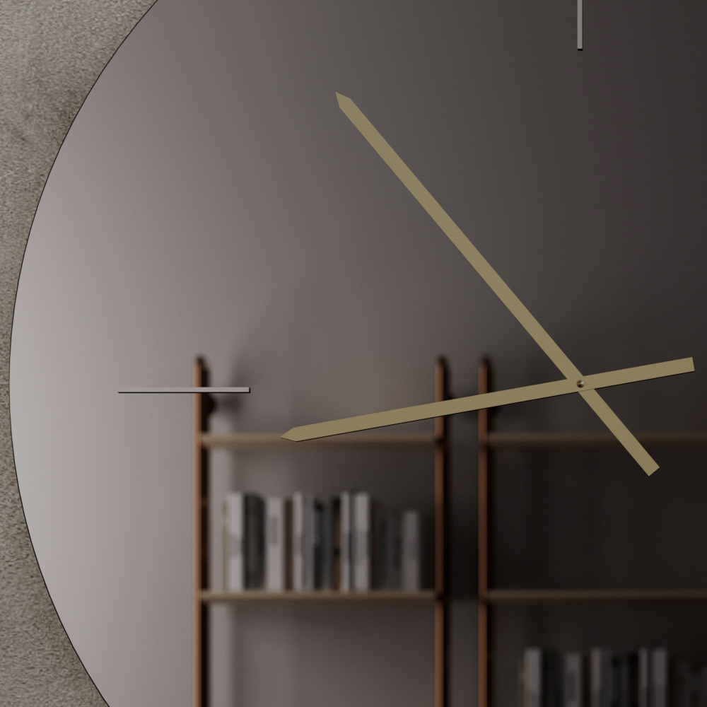 Le lancette in ottone satinato, sottili ed essenziali, emergono con eleganza sul fondo fumé creando un contrasto ricercato e armonioso. Il design minimal, privo di elementi superflui, rende questo orologio un vero oggetto decorativo capace di impreziosire soggiorni moderni, sale da pranzo, uffici direzionali e ambienti contract.