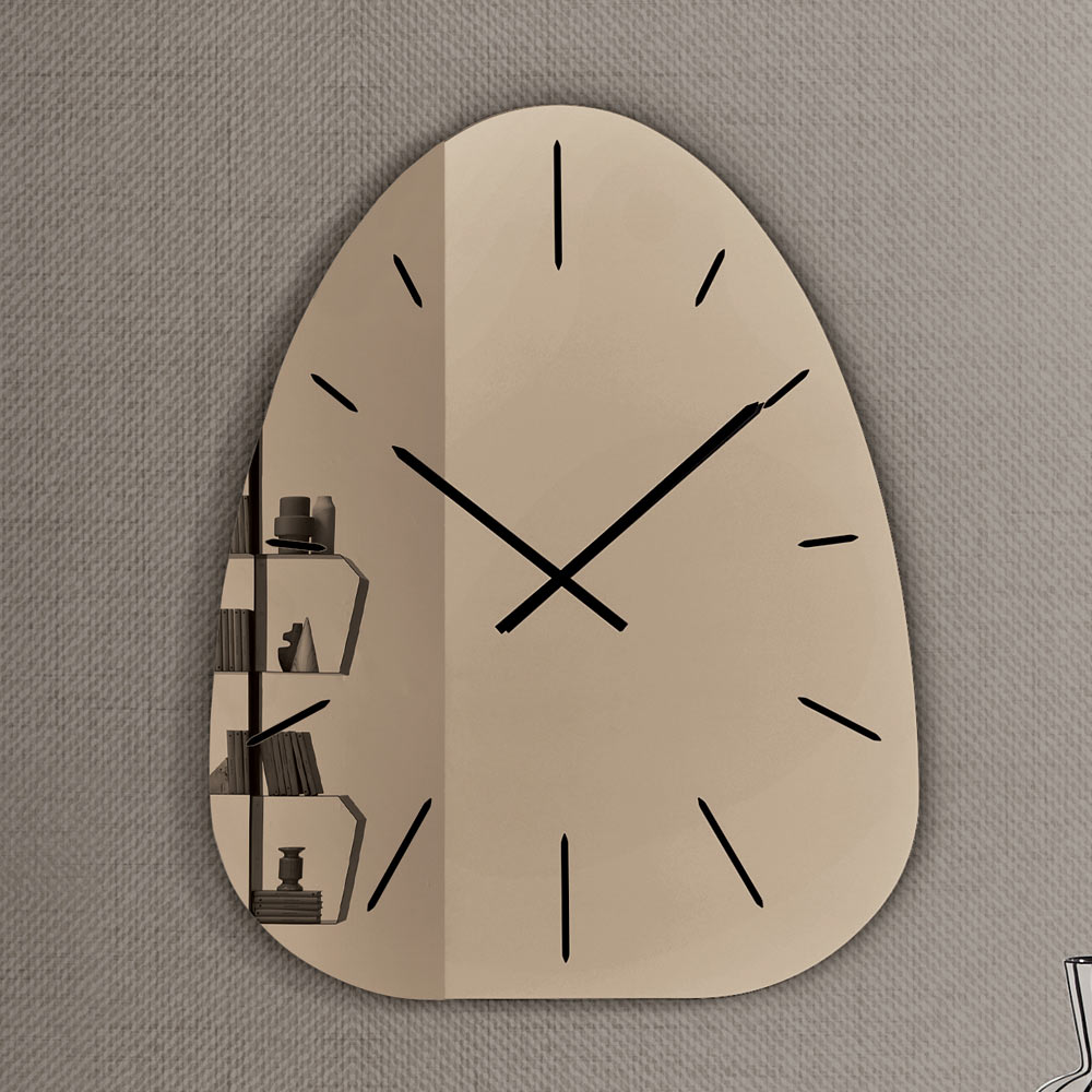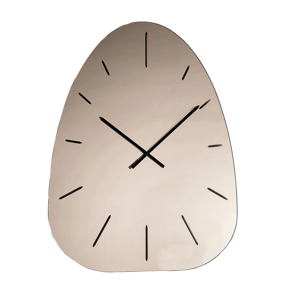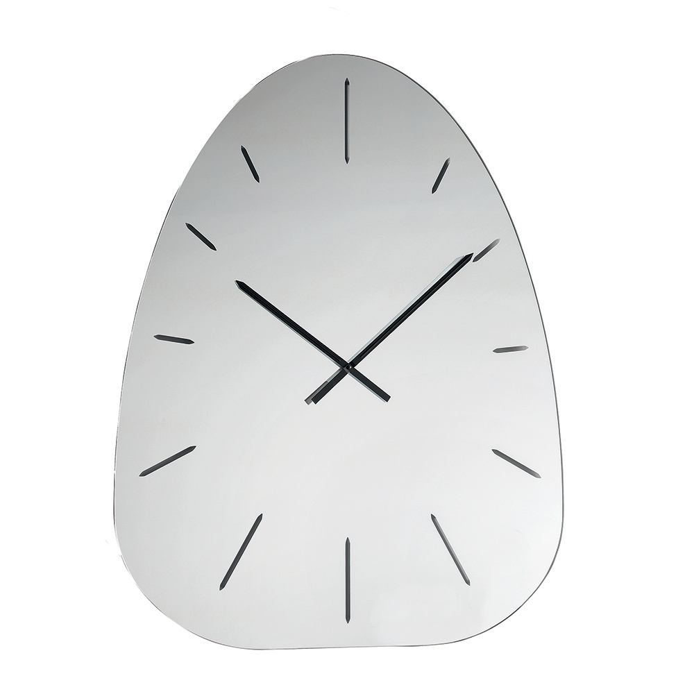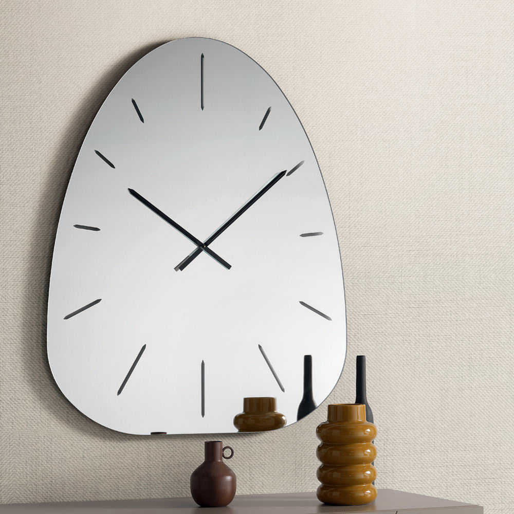Realizzato in vetro specchiato, l’orologio si distingue per i numeri incisi a laser che emergono con discrezione dalla superficie riflettente, creando un raffinato gioco di luce e profondità che varia durante la giornata.