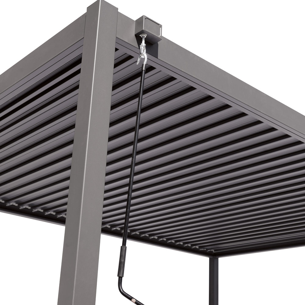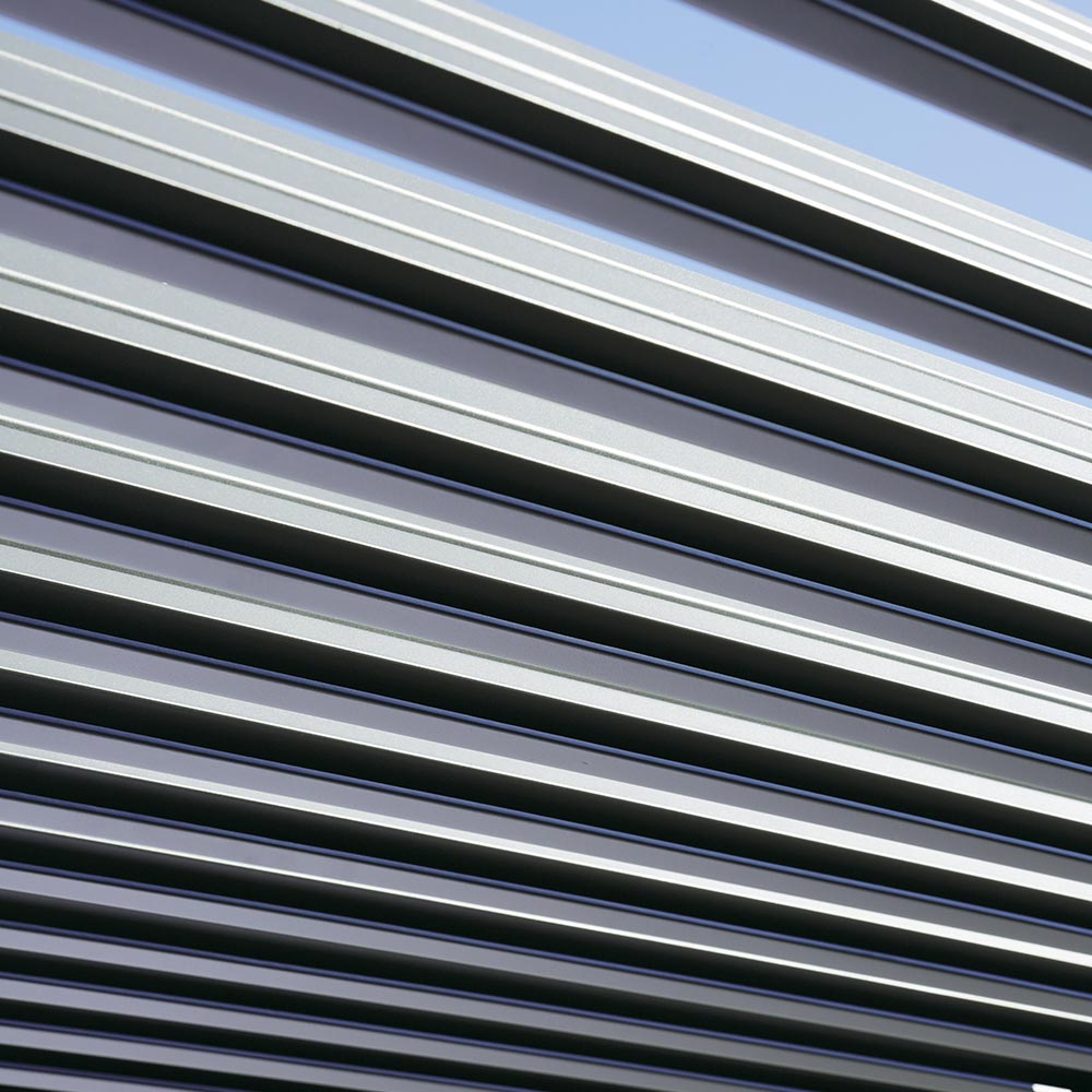 I pali portanti da 90 x 90 mm in alluminio e i traversi del tetto da 120 x 30 mm / 147 x 30 mm offrono una struttura solida e affidabile. Il tetto lamellare orientabile, azionabile tramite manovella esterna in acciaio, consente di regolare facilmente l’ingresso della luce e la ventilazione, creando l’ambiente ideale in ogni momento della giornata.