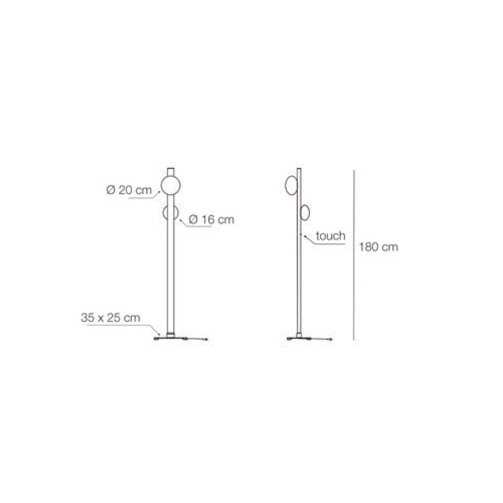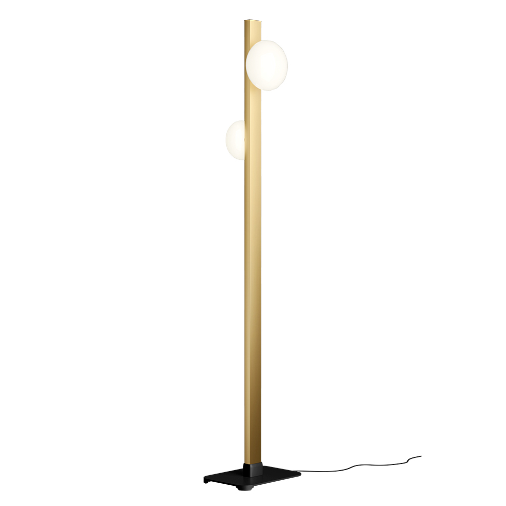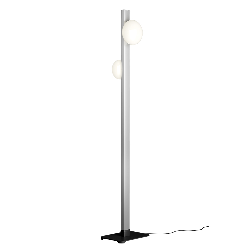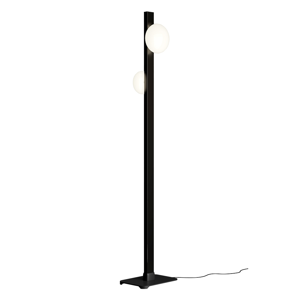 Questa piantana da terra è un perfetto equilibrio tra design scultoreo ed eleganza funzionale, ideale per valorizzare qualsiasi ambiente con uno stile moderno e ricercato. La struttura verticale snella e geometrica ospita due diffusori sferici in vetro opalino, che sembrano sospesi in un equilibrio perfetto, regalando una luce morbida e avvolgente.