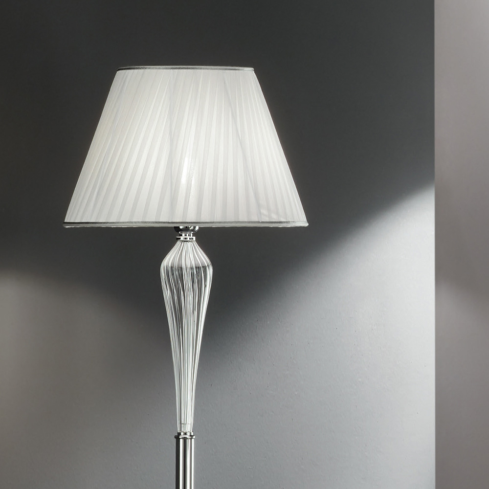 La caratteristica peculiare è data dai preziosi motivi prodotti in vetro lavorato a mano in Italia effetto "rigaton" che lascia intravedere l'anima in metallo e che sorregge il paralume in tessuto bianco effetto plissè.