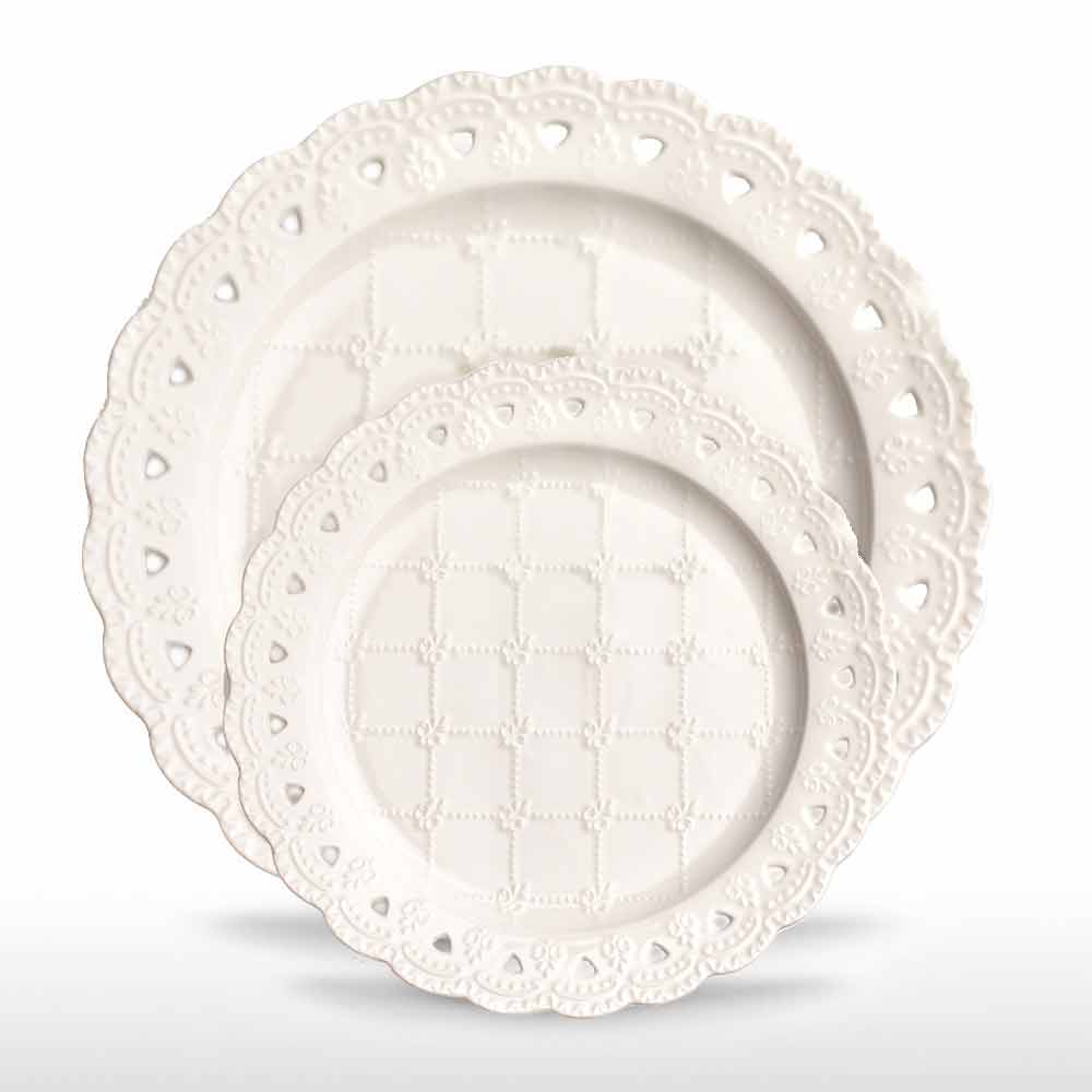 rilievi floreali e decori traforati a mano che esaltano le pietanze rendendo la tavola glamour e di classe.