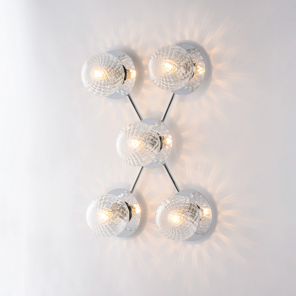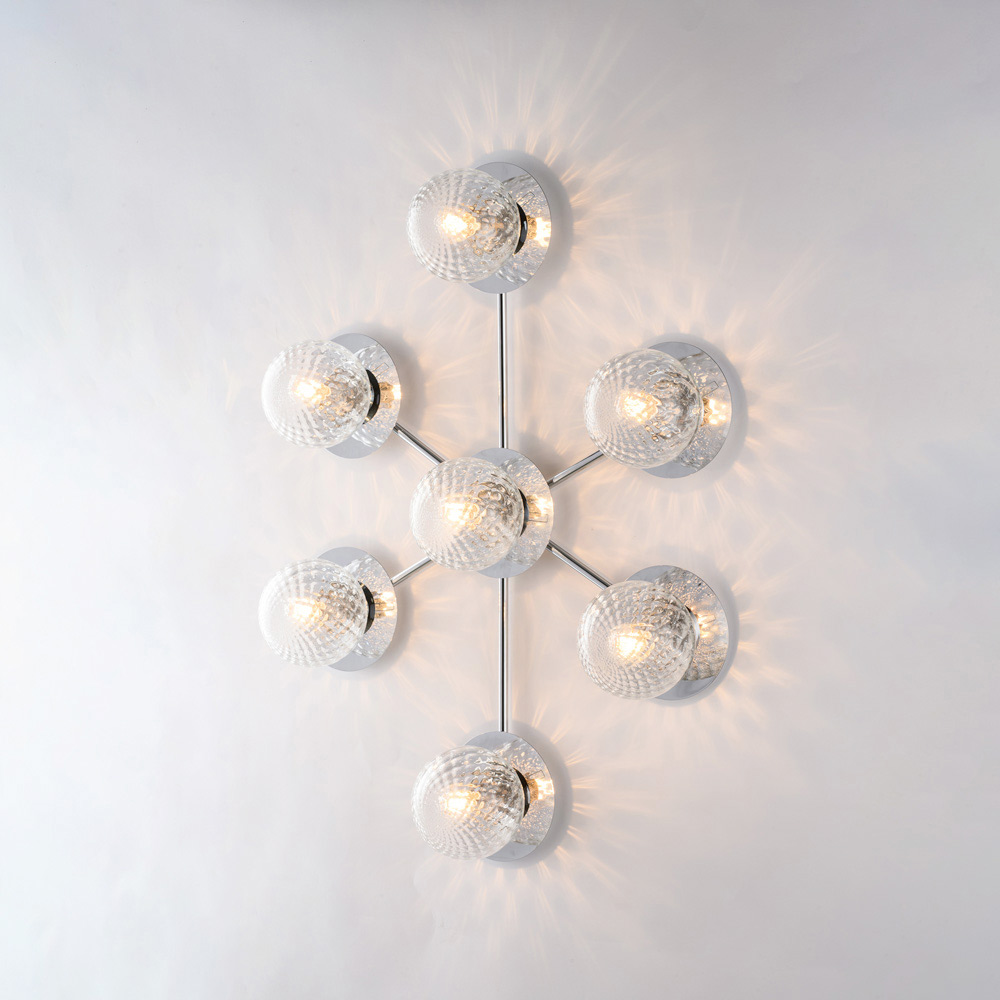 Scenografica e contemporanea, questa plafoniera artigianale in ferro si distingue per la sua composizione dinamica e moderna. La struttura ramificata ospita diffusori sferici in vetro disposti in modo equilibrato, creando un suggestivo gioco di luci e riflessi che valorizza il soffitto e illumina l’ambiente in maniera uniforme.