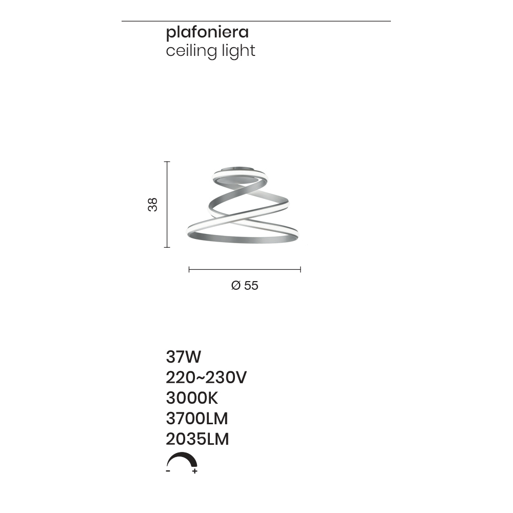 Plafoniera con struttura in metallo verniciato biancocompleta di fonte luminosa a LED. Un design dinamico e moderno capace di ricreare la sensazione di un nastro che volteggia arricchendo così il valore e l'estetica del prodotto. Questa sensazione di movimento diventa il suo punto di forza e le pemette di conquistare il centro dell'attenzione all'interno di ambienti domestici o contract dallo stile contemporaneo e all'avanguardia. La moderna tecnologia LED assicura inoltre un'illuminazione di qualità complendo la lampada e rendendola un complemento ottimale per chi ricerca funzionalità e design in un unico prodotto.