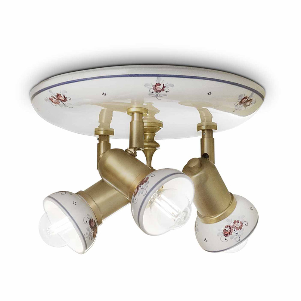 Plafoniera tonda a 3 luci in ottone e ceramica dipinta a mano, made in Italy by Ferroluce.