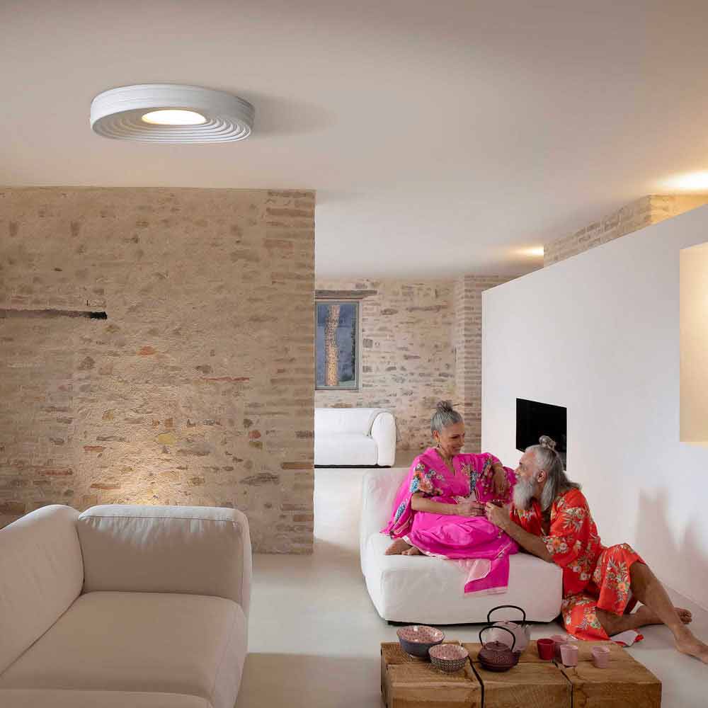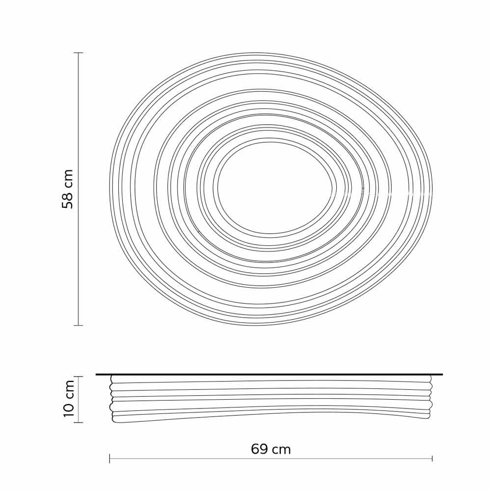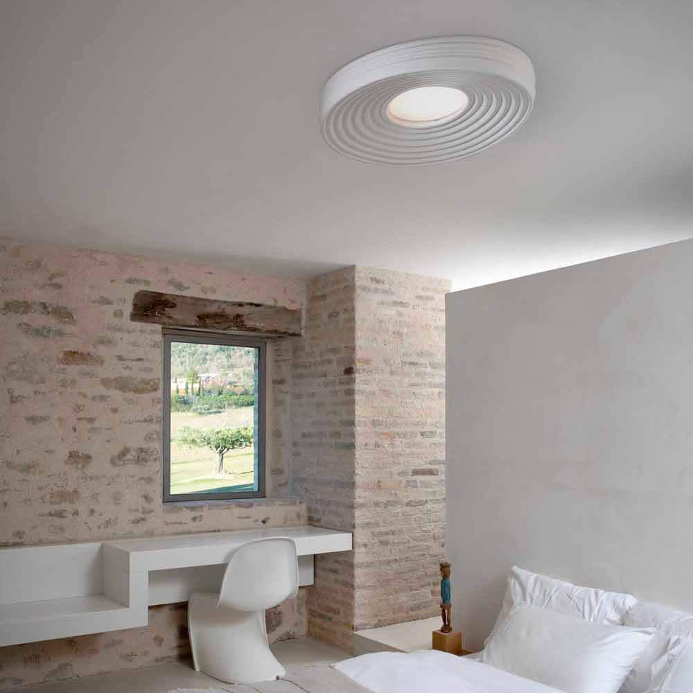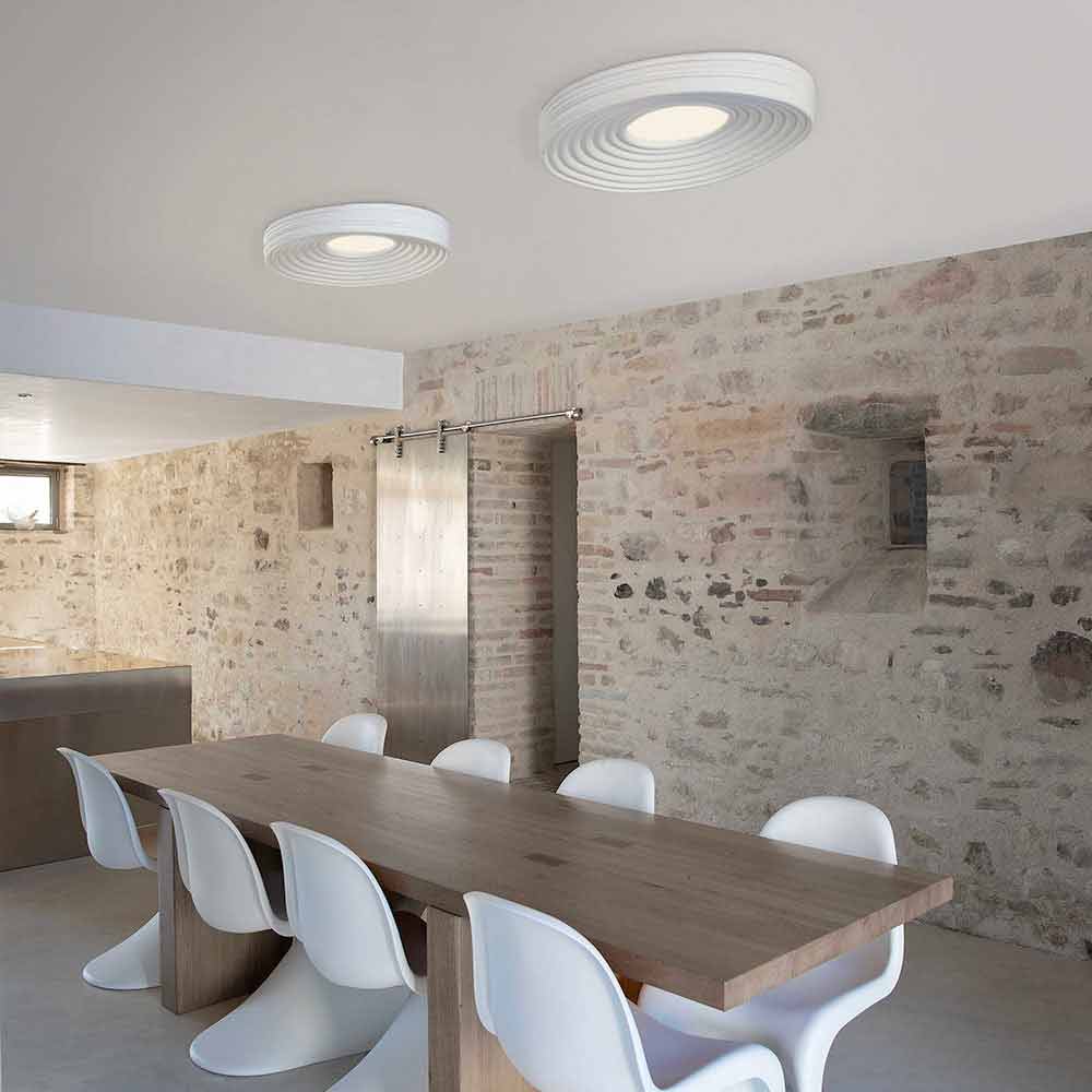 Questa originale e singolare plafoniera crea meravigliosi giochi di luce granzie alla parte centrale che garantisce illuminazione diretta e che si propaga sulla superficie della lampada, riflettendosi in cerchi concentrici.