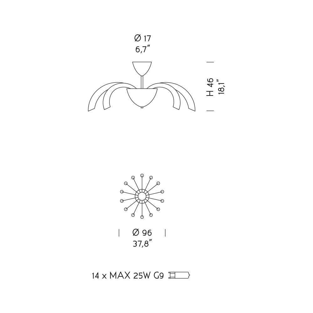 Plafoniera a 14 luci realizzata in vetro di Venezia finitura ambra lavorato artigianalmente da abili maestri vetrai italiani e arricchito da dettagli in metallo cromato. Un'estetica coinvolgente che si adatta ad ogni tipologia di ambiente in cui si inserisce con esuberanza grazie alle sue forme e alla funzionalità del suo design. I meravigliosi ed eleganti bracci curvilinei si espandono verso l'esterno per portare luce in varie direzioni e illuminare la stanza attraverso un originale effetto scenografico che ricorda l'esplosione dei fuochi d'artificio per un risultato creativo, raffinato e di forte impatto visivo.
