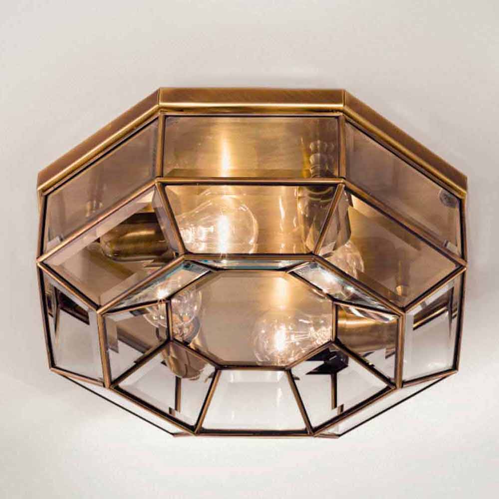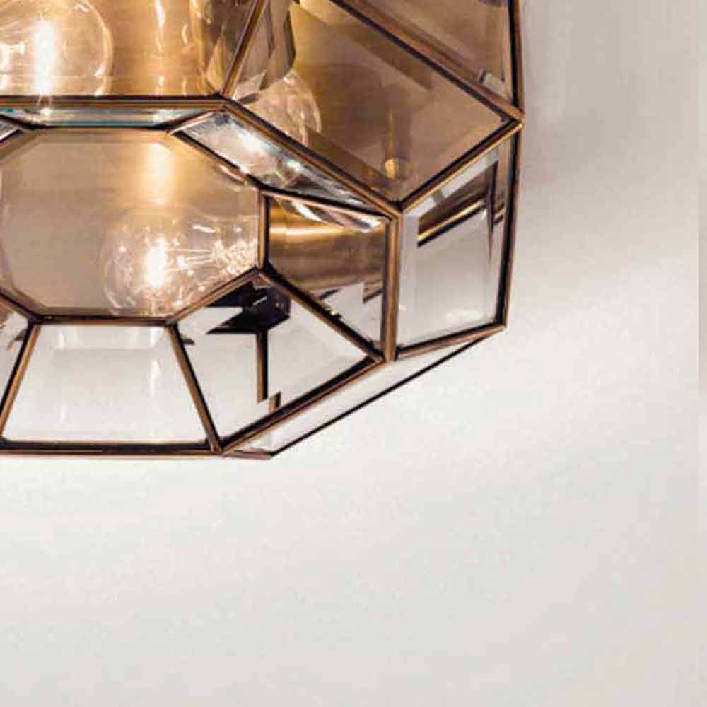 Plafoniera a 4 luci ottagonale in ottone e vetro di design artigianale made in Italy.