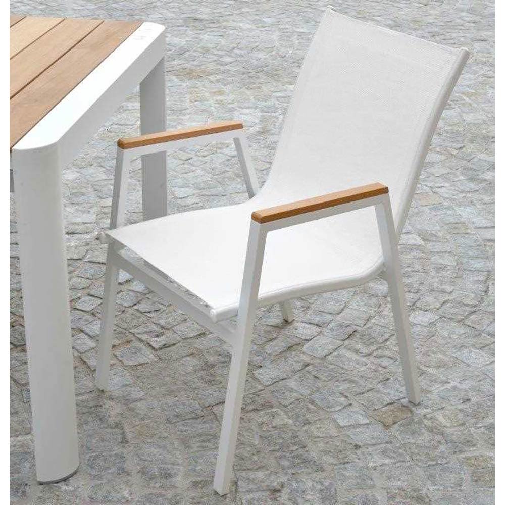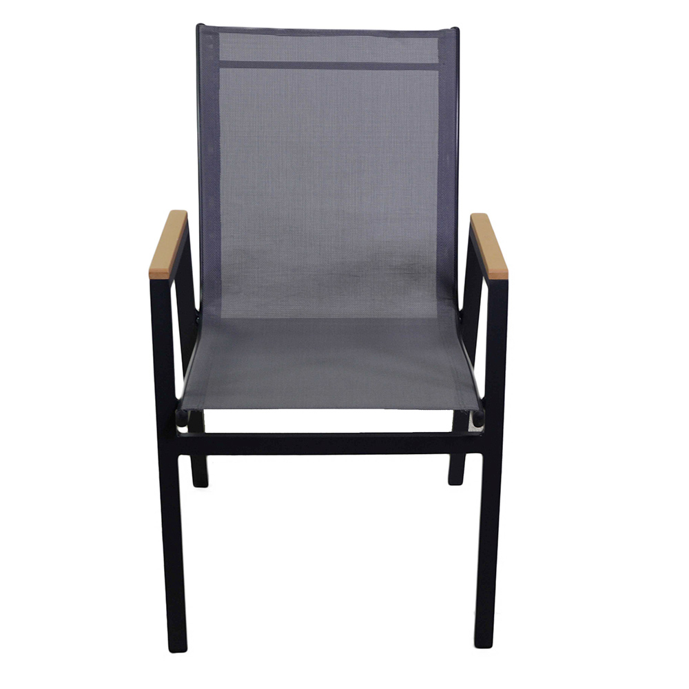 Questa poltrona con struttura in alluminio verniciato a polvere unisce stile e funzionalità, perfetta per completare qualsiasi spazio esterno moderno. Il tessuto in textilene garantisce resistenza agli elementi e comfort duraturo, mentre gli inserti in legno sui braccioli aggiungono un tocco di calore e eleganza.